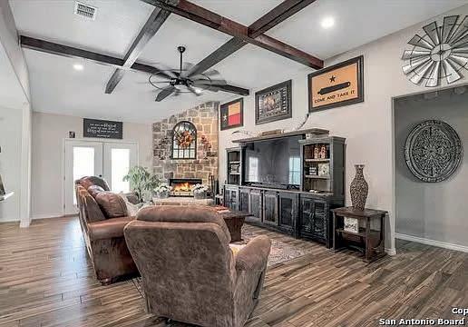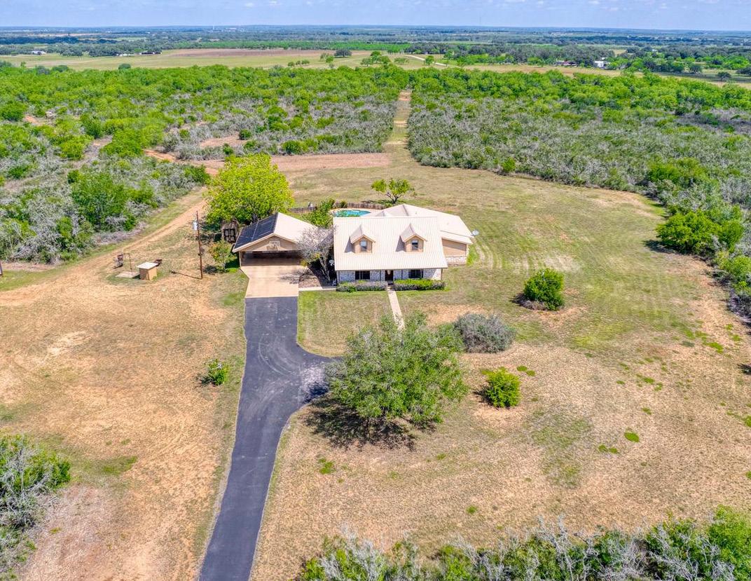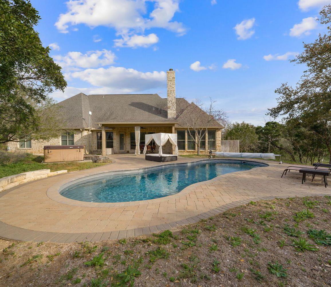 This country home is a serene retreat with its peaceful surroundings and convenient location. The property's 5 acres provide ample space for privacy and relaxation, while its proximity to IH-10 offers easy access to nearby cities like San Antonio, Seguin, New Braunfels, and Austin. One of the highlights of the home is the outdoor space, with a Keith Zars pool offering a perfect spot to unwind while taking in the picturesque views of the countryside. Indoors, the two-story Great Room with built-in bookshelves and a fireplace creates a cozy atmosphere for gathering with family and friends. The kitchen appears well-equipped for hosting large gatherings, featuring a long-service bar area for entertaining. Additionally, the spacious media/game room and family room provide plenty of room for recreational activities and everyday living. With four bedrooms upstairs and the primary bedroom downstairs, the layout offers both privacy and convenience. The primary bedroom's access to the pool adds to its appeal, providing a seamless indoor-outdoor living experience. The inclusion of a home office or craft room, as well as a spacious workshop is well-suited for both relaxation and productivity. Overall, this country home offers a perfect balance of tranquility, convenience, and functionality. https://vimeo.com/924759456