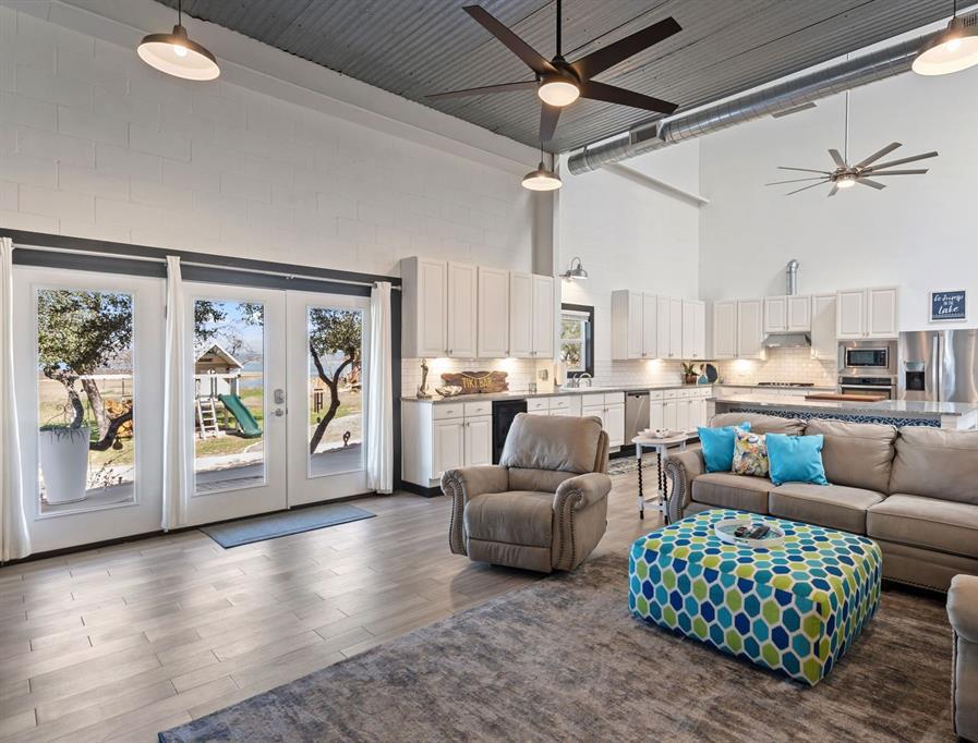 This beautiful, custom waterfront home is nestled perfectly on Inks Lake. Featuring 14-ft ceilings in the main areas, luxury vinyl planking throughout, Uttermost light fixtures, and tons of storage, this home was built with every luxury in mind. The dreamy chef’s kitchen is perfect for entertaining!