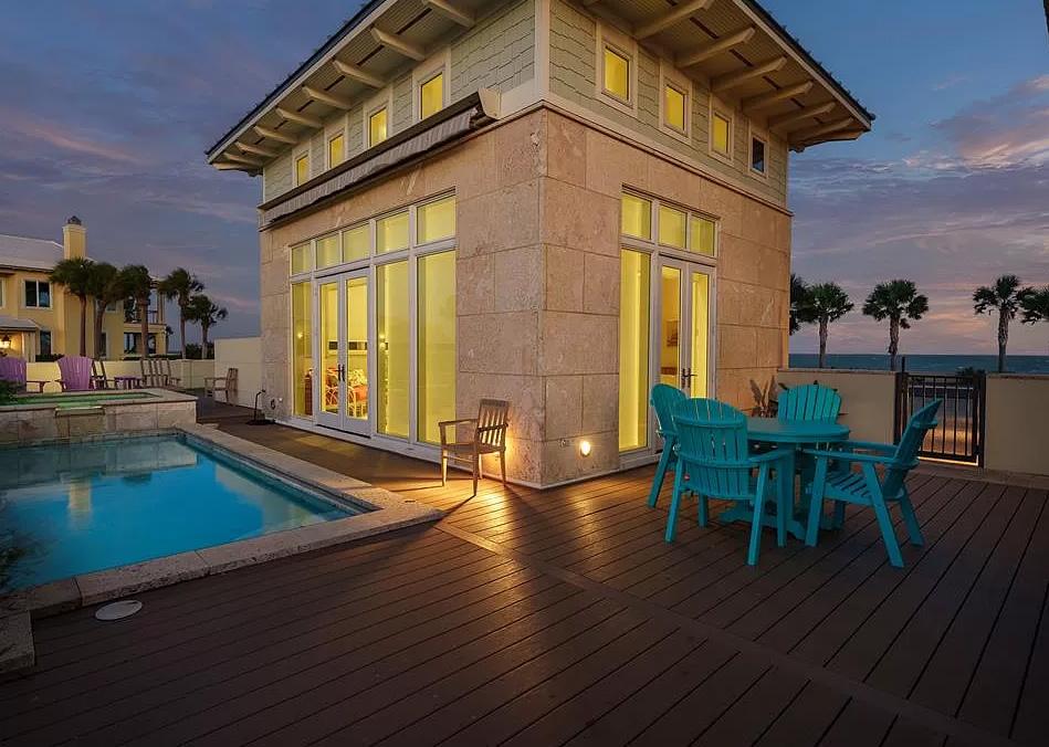 Beach home/rental Condo. Pool & hot tub. Four assigned parking spaces and sleeps eight on two floors. Fully furnished with MCM, intl. decor & paintings. Includes shutters for all windows. Travertine marble-tiled, 20 x 40 Gourmet Kitchen with state-of-the-art brushed steel appliances (fully warranted). Granite countertops. Closed door pantry with appliance garage. Washer-Dryer area off kitchen. Upper floor features 2 bedrooms with ensuite baths and closets.