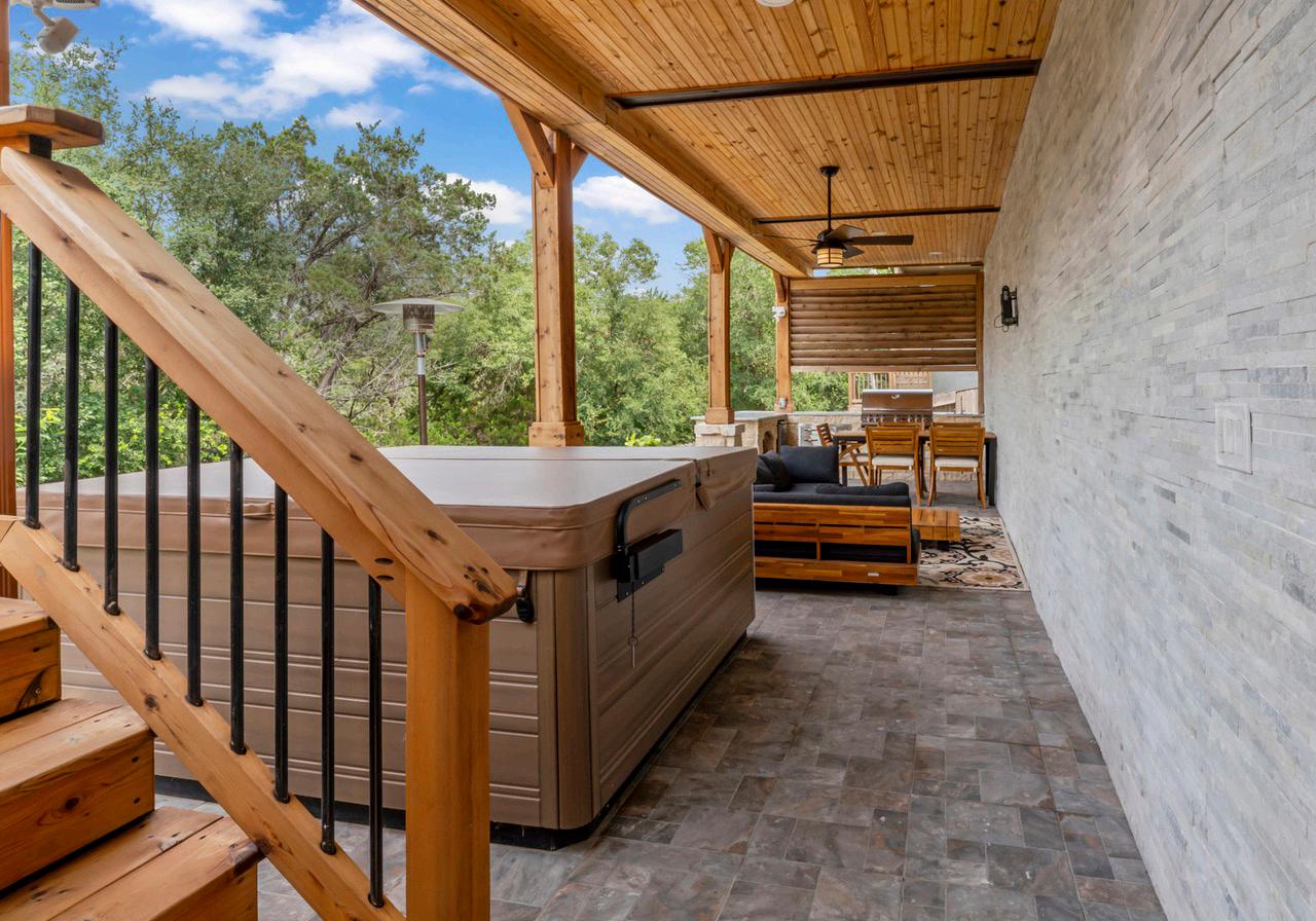 The primary suite features a spa-like bathroom complete with a sauna, oversize closet and flex space. The gourmet kitchen with stainless steel appliances is ideal for both entertaining and casual dining. Enjoy outdoor living with a covered patio, hot tub, d panoramic views. Updated with a freshly epoxied 4-car garage and a circular driveway, this home blends upscale living with the convenience of top rated Lake Travis schools and nearby shopping in Lakeway and Hill Country Galleria.