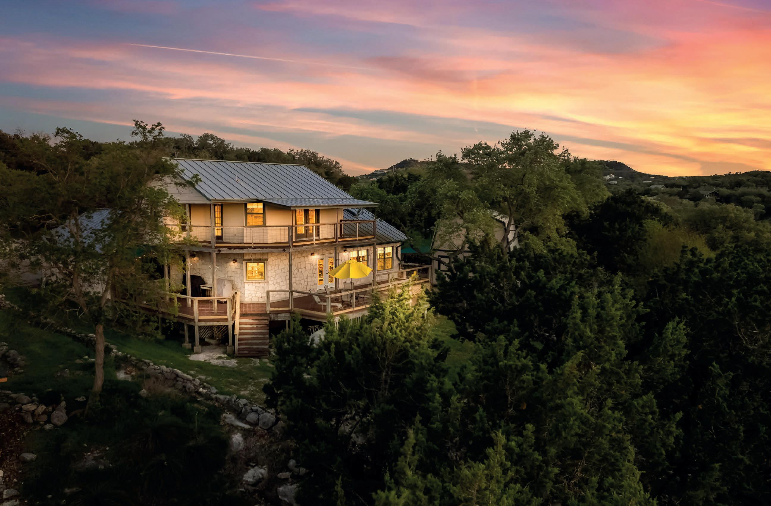 Hilltop Living Abounds! Nestled atop a hill, on the outskirts of town, this meticulously crafted stone residence offers the epitome of luxury living with unparalleled attention to detail and stunning features. Perched above Burnet, Texas, the property provides an oasis of tranquility with awe-inspiring views of the Hill Country, affording a short drive to both Inks Lake and Lake Buchanan, offering a perfect blend of seclusion and convenience. Built in 2000, the main home boasts 2400 square feet of living space, featuring 5 bedrooms and 3 baths. Elegant touches include a built-in office desk, stainless steel appliances, open dining, and a warming gas-burning fireplace, creating an inviting atmosphere for both relaxation and entertainment. Step outside onto the spacious patio that beckons outdoor entertaining while capturing the essence of Hill Country living. Constructed in 2005, the guest home is a harmonious blend of comfort and style.