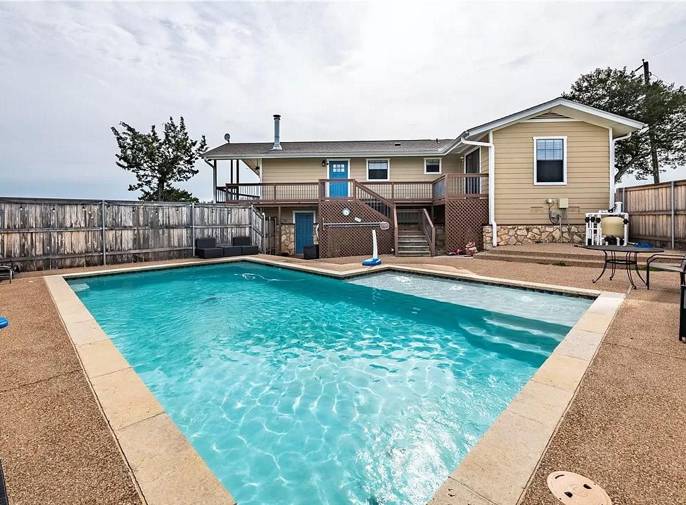 Price Improvement! Furnished two-story, 3 bedrooms/3 baths, two singlecar garages and privacy fenced back yard with 3.0-5.5 ft deep salt-water pool. Second-floor has a master bedroom/bath and separate bedroom/ guest bath, open kitchen-living-dining area. Kitchen opens out onto the 2nd-floor deck overlooking and accessing the beautiful pool. The 1st floor has a bedroom/bath with access to the pool/yard area. 2401