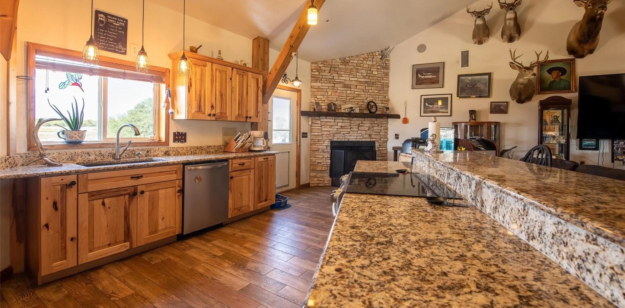 Welcome to your new hilltop country paradise! This beautiful 4-bedroom home overlooks a clear pasture, a 14foot deep pond, and a stunning yearround creek that attracts local wildlife. The home features stunning saddle brown and gold stained concrete floors throughout, and the open floor plan, complete with stainless steel appliances and oversized windows, allows natural light to flow throughout the home.