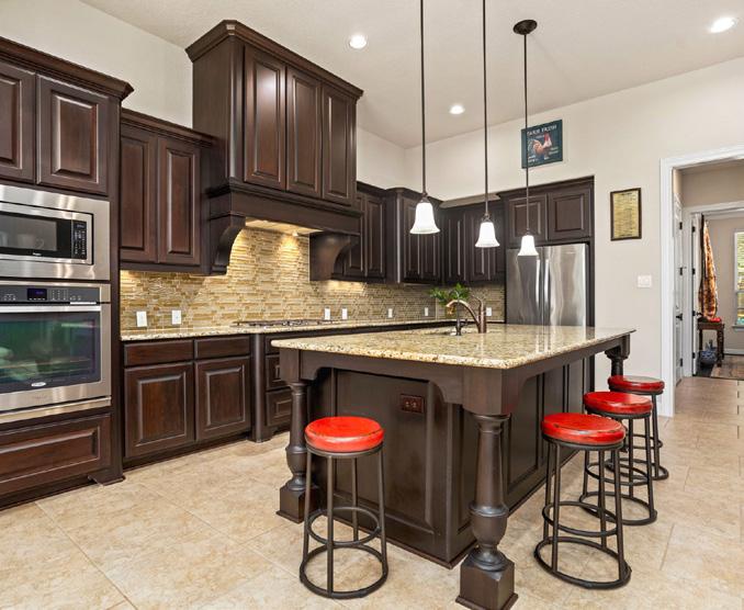 A hidden gem nestled in the sought-after Woods subdivision of Sonterra’s gated community, this onestory features impressive floor-to-ceiling windows in the main living space, showcasing the inviting inground pool and waterfall, mature-live oaks, and a covered patio perfect for entertaining. The adjoining backyard oasis features lush landscaping and an outdoor grill, ideal for dining al fresco, or enjoying your morning coffee. Inside, the chef’s kitchen is complete with stainless steel appliances, ample storage space, and generous counter space for island cooking. The large utility room adjacent to the kitchen also has a conveniently located half bathroom for guests and when entering from the garage. The primary bedroom is privately located in the back of the home and has a remodeled bathroom en suite, including an oversized zero-entry shower as well as dual walk-in closets and vanities. The house has two additional bedrooms off the main hallway: one with an en-suite bathroom and another with a hallway-bathroom entrance. A flexible, separate office space/fourth bedroom off the hallway provides both plenty of separate spaces while maintaining the cohesiveness of the single floor. Recessed lighting, cabinetry and plantation shutters are just a few custom details throughout the home, bolstered by ample natural light, vaulted ceilings, crown moulding, ceiling fans and a cozy doublesided wood burning fireplace connecting both living areas. The oversized attached 2-car garage is ideal for storage and refrigeration. Perhaps its best asset is the prime location: tucked away in a quiet corner of the neighborhood, this custom home can provide easy access to the club, golf, swimming pool, tennis courts, shopping and nearby restaurants via golf cart.