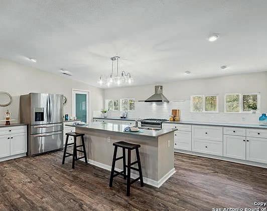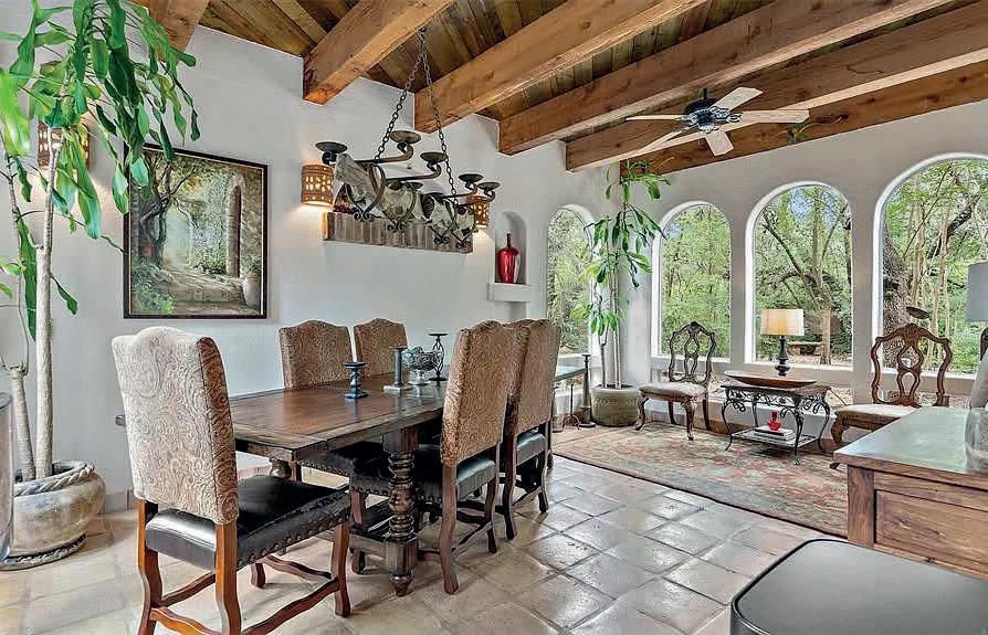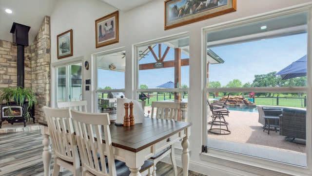 Welcome to your dream home—a stunning custom French country chateau nestled on 10+ level acres in the breathtaking Texas Hill Country. This exquisite estate offers the perfect blend of sophistication and seclusion. As you enter this masterpiece, you’ll be greeted by timeless elegance, with every detail meticulously crafted to create a warm & inviting atmosphere. The home offers both a formal living/sitting area and dining/office up front, then welcome to the full service wet bar with sink, backing to the powder bath and across from the dedicated wine storage. The main living/dining/kitchen to a chef’s delight cuisinary complete with a plethora of custom cabinets with glass panel uppers, quartz countertops, large island, stainless steel appliances with gas range & pot filler. The island is graced by gorgeous seeded glass pendants. The open dining area adjoins for ease in serving and flows seamlessly into the main living area.