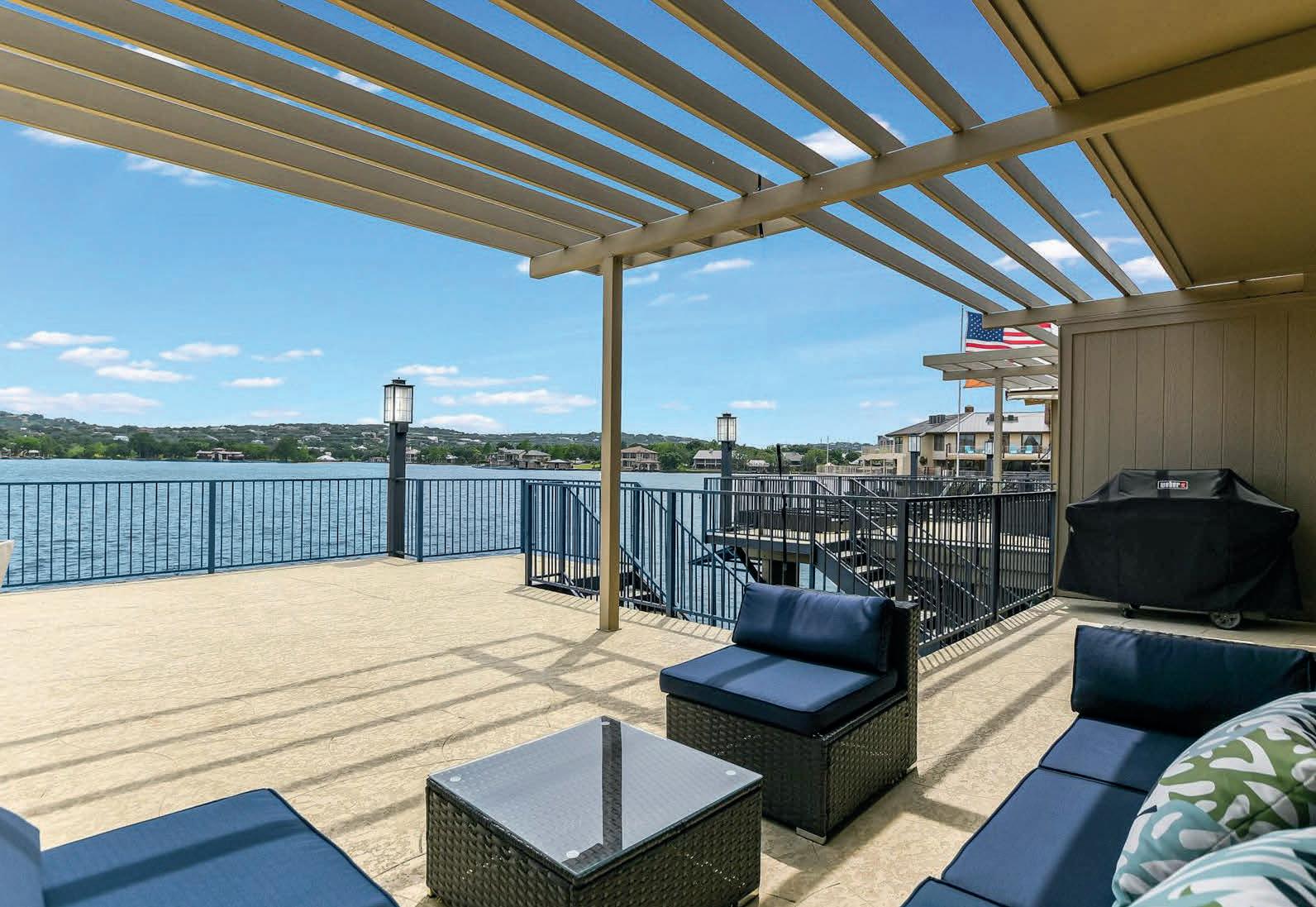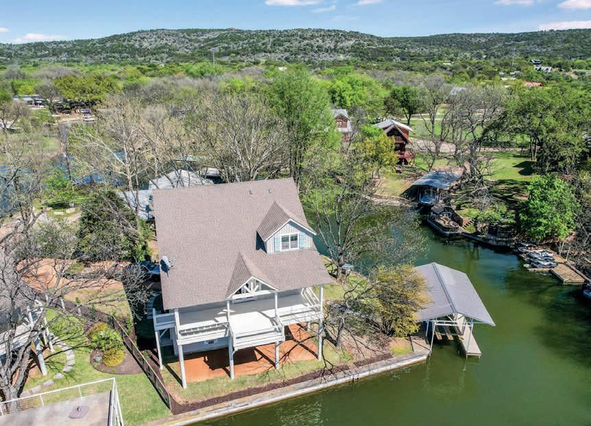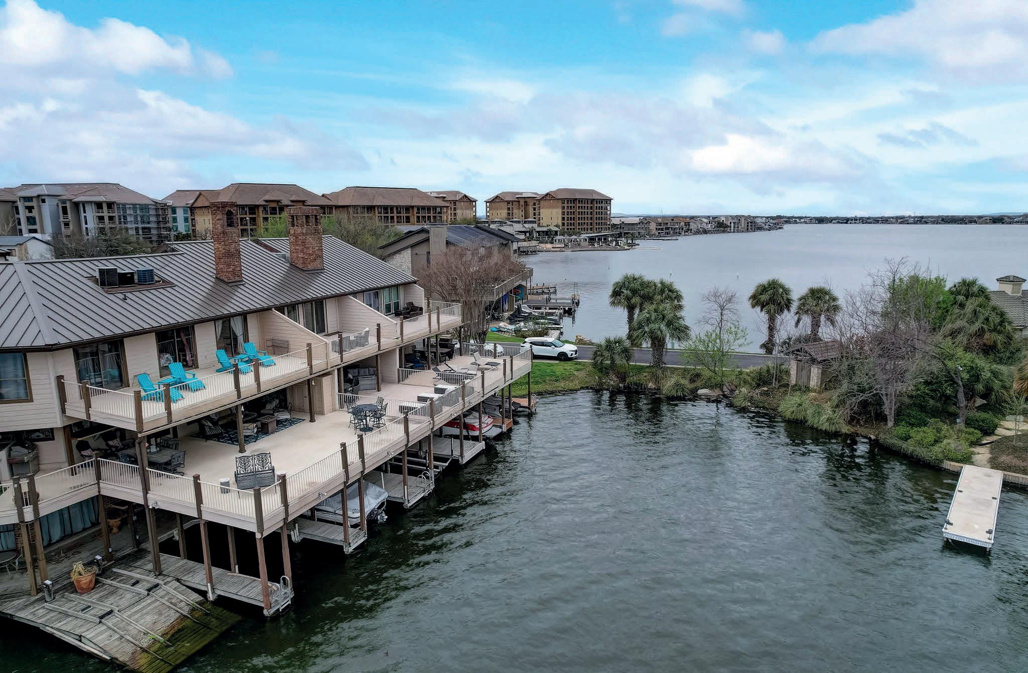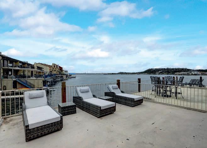 4 BEDS | 4 BATHS | 2,506 SQ FT | $1,765,000 | This Lake LBJ waterfront townhome offers a chance to be in the heart of Horseshoe Bay and within walking distance to the Horseshoe Bay Resort and its world-class amenities. (*Membership required to enjoy amenities). You could be enjoying fantastic southeast facing views of the open water from your patio by the summer! Inside, the main level is filled with natural light shining through a wall of glass doors and windows that frame the panoramic views. The open floor plan features dining and living areas which offer access to the 300 sq ft mainlevel patio overlooking the open waters of Lake LBJ – the perfect spot to catch the annual July 4th fireworks display surrounded by family & friends. The updated kitchen boasts stainless steel appliances and granite countertops. The main floor also boasts a spacious guest room and full bath. Two additional bedrooms are upstairs, including the primary suite, which opens to a terrace overlooking the lake where you can enjoy morning coffee. Travel downstairs to find access to the attached garage and a large bedroom with a seating area, a walk-in closet and a full bath. Here you can access the lake-level patio, the boat slip, and the PWC lift, or you can use the outdoor stairs to join friends and family on the main-level patio.