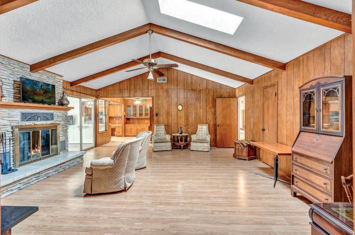 Upon entry, you'll find marble tile flooring throughout the open floor plan. The spacious living room seamlessly flows into the dining area and a separate family room, featuring a cozy fireplace and beautiful wooden ceiling beams. This room connects to the kitchen and a covered outdoor patio. The kitchen offers ample cabinet space and striking wood accents. Additional highlights include an office, an expansive master bedroom—with a fireplace, wood flooring, a walk-in closet, a beautiful master bathroom with walk-in shower, and access to the covered patio. There are two additional beautifully appointed bedrooms, a separate bathroom, and a convenient individual laundry room. Enjoy your private oasis with a pool, jacuzzi, and an outdoor bathroom. The home includes a 3-car garage and additional parking for up to 5 vehicles, totaling 8 parking spots—perfect for car enthusiasts or as an ideal Airbnb.
