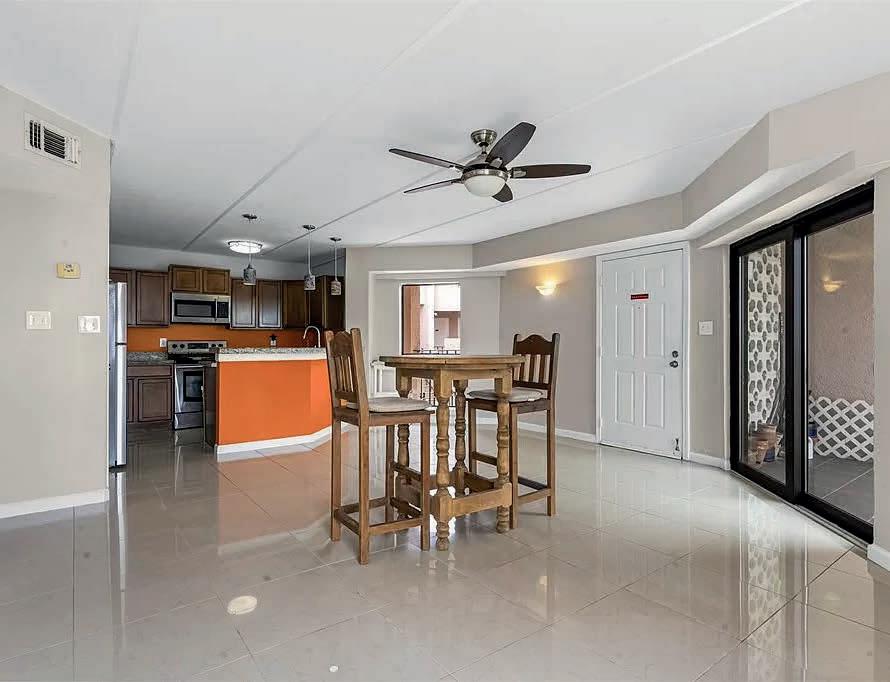 Beach home/rental Condo. Pool & hot tub. Four assigned parking spaces and sleeps eight on two floors. Fully furnished with MCM, intl. decor & paintings. Includes shutters for all windows. Travertine marble-tiled, 20 x 40 Gourmet Kitchen with state-of-the-art brushed steel appliances (fully warranted). Granite countertops. Closed door pantry with appliance garage. Washer-Dryer area off kitchen. Upper floor features 2 bedrooms with ensuite baths and closets. Listed by Paul Gifford