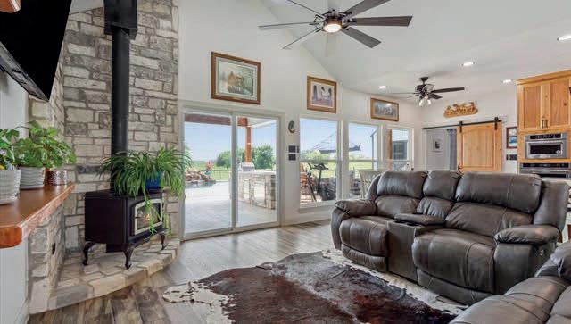 Welcome to your country retreat! Private 15.98 acres in Eastern Burnet County with a phenomenal custom home standing at over 3500 sqft, four or five bedrooms and 4.5 bathrooms. Enter into this luxurious retreat built in 2020 to find soaring vaulted ceilings in the Great Room with a warming stone fireplace flanked by french doors. The kitchen is truly the heart of the home with its massive center island, exquisite countertops, soft close cabinets and drawers, glass display cabinets, stainless steel appliances, double wall oven, electric cooktop, and island microwave; additional dining space adjoins. Large laundry with pass thru convenience to the primary closet. Great storage space with plenty of pantry space abounds.