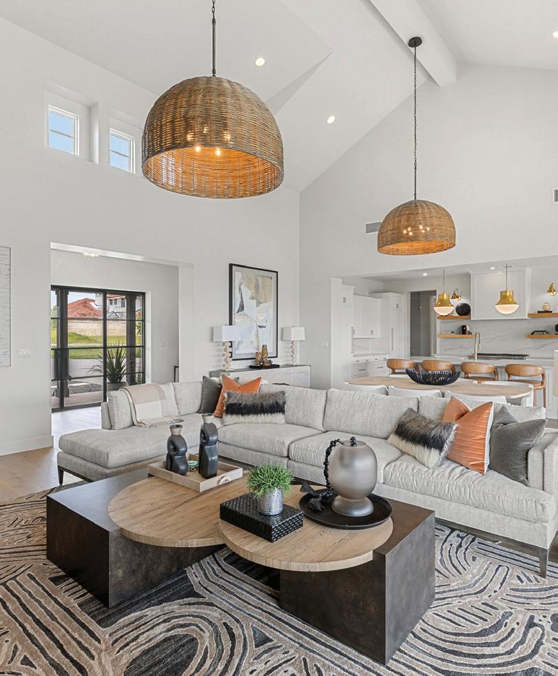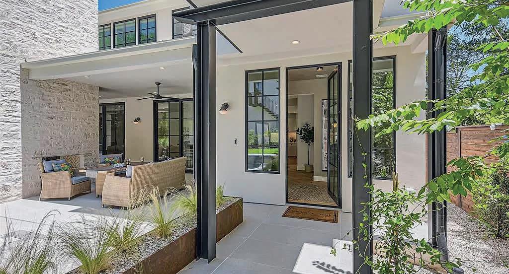 Step through the custom designed dual oversized floor to ceiling pivoting glass front doors with luring views of the exterior fire pit! Upon entry you are greeted by a refined, open-concept layout that seamlessly blends the indoor and outdoor living spaces with two expansive living room areas, custom reclaimed wood accents, and a massive stone fireplace. Soaring ceilings, up to 24 ft high, create a grand ambiance. This home is dripping with thoughtful designer details - square smooth walls and a square motif throughout to create harmony.