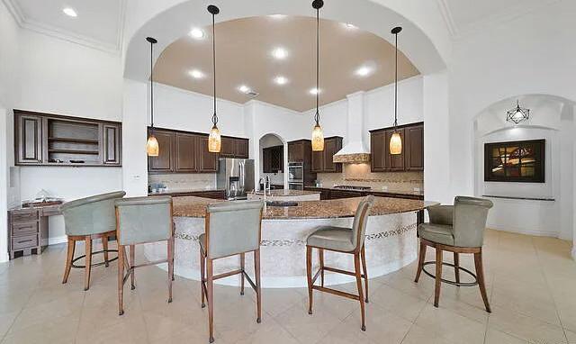 Step outside to the resort-style backyard meticulously designed with IPE a whimsical wood deck and oversized fire pit drawing you in to gaze at those stunning views from the custom negative edge oversized salt water pool. A covered travertine tanning deck with an outdoor kitchen, fridge, bbq, and green egg to host! Enjoy music through the crisp sounds with the built in outdoor speakers and your favorite movie on the outdoor TV!