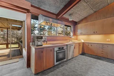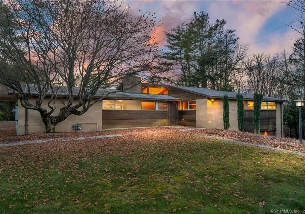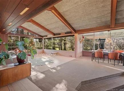 Fantastic opportunity to own this one level 4186 square foot mid-century modern home in the heart of Spring Glen on a private 1.87-acre landscaped property, minutes to New Haven. Welcoming wide bluestone entry walk leads you to the front door and into the spacious entrance foyer. Sun filled south facing Living room with fireplace and built-ins and Dining Room both have walls of glass sliders that lead out to the generous size bluestone patio. The primary bedroom suite offers a skylit office with a wall of built-ins as well as a skylit walk in closet and private bath with both stall shower and tub. There are an additional three bedrooms with abundant closet space on this level (one which has a private bath). A library with walls of bookshelves is located in a quiet wing of the home. A later addition to the home is this multi-purpose music/media/great room with tall ceilings, built-ins, and skylights. 90 minutes to NYC!