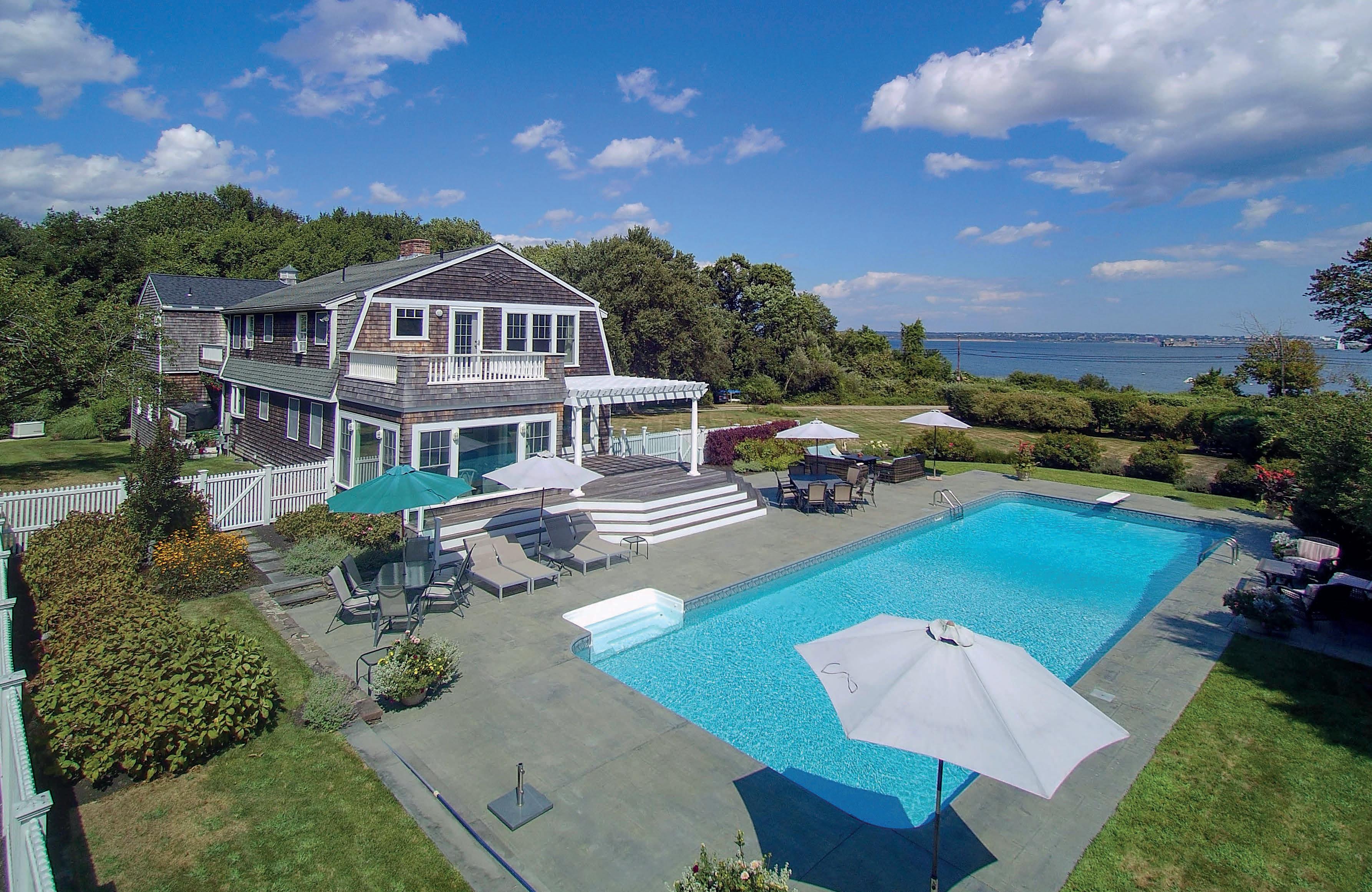 Up on a hill with stunning views of Narragansett Bay and just a few steps to deeded beach, this 4,030 sq ft residence offers a versatile, light filled interior, living room with fireplace and sliders to the deck, large family room and sunroom with access to the outdoors; spacious master bedroom with bathroom, walk-in closet and large deck overlooking the bay. Nearly two acres of private grounds with a 60 ft salt water heated swimming pool and beautiful gardens framed by a stone wall, spacious patio with multiple sitting areas and epi decks facing the sweeping water views are perfect for outdoor entertainment, relaxation, and al fresco dining. Experience waterscapes, beach, sun-and-moon rise and watch sail boats passing by. Launch your kayak or canoe, sunbathe and swim. Separate guest apartment with bathroom, full kitchen and living room with spectacular water views, recreation/playroom with two balconies - one facing the water and another facing the gardens - home gym, three car garage, ample parking and whole house generator are other highlights of this comfortable, perfect for large gatherings home. New 10 zones AC system is just installed. Close to village and its cafes, restaurants, and marina, yet with easy access to highway. six miles to downtown Newport, 36 miles to TF Green Airport, 67 miles to Logan Airport, 12 miles to Kingstown Station.