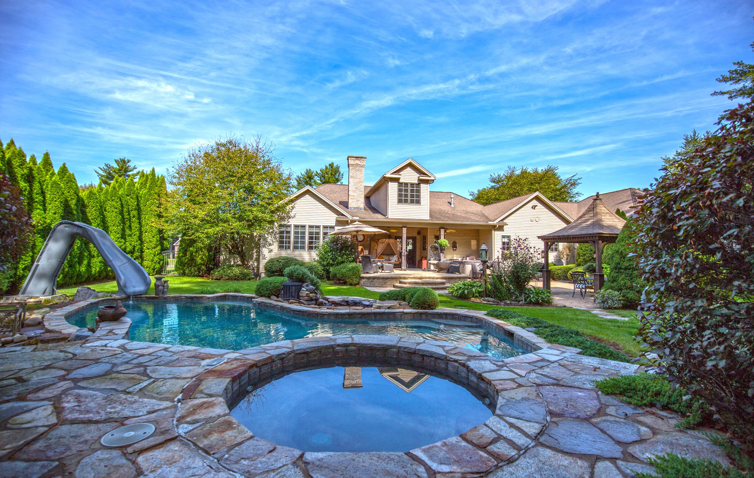 relax in the family room with wood-burning fieldstone fireplace with custom mantel and bluestone hearth. Gourmet kitchen boasts cherry cabinetry, stone backsplash and cove, center island. State-of-the-art home theater complete with specialized theater lighting and drapes, skylite, and all new audio and visual equipment. A private casino room with actual casino blackjack tables! Park-like grounds with established plantings and 9 zone irrigation, heated Shotcrete kidney shape pool with koi pond, spa has a sheer descent waterfall, and a stone paver patio off the sunroom with free standing spa. Situated in premiere neighborhood setting only 14 miles and 22 minutes to Bradley International Airport.
