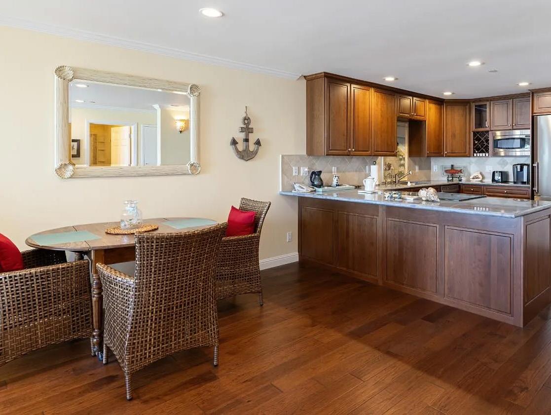Featuring two bedrooms with wooden flooring, the interior combines warmth with modern aesthetics. The primary bedroom, bathed in natural light, ensures restful nights and energized mornings. The full bathroom and additional half bath, both luxuriously upgraded, include a marble shower for added opulence.