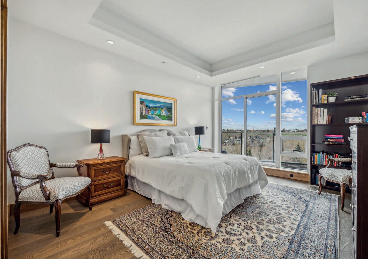 oven, tons of storage, and a beautiful built-in glass door china cabinet. The primary bedroom offers outstanding river views and access to the large balcony, so you can relax surrounded by the serenity of singing birds and nature. Building amenities include a private gym, 24-hour concierge/security service, three car wash areas and a private party room with a bar. Steps away from the amenities and dining experiences of Kensington via the Peace Bridge, downtown offices and shopping, outdoor recreation at Prince’s Island Park and the endless amounts of walking and cycling pathways in the area. An exquisite condominium in an immaculate location along the river that offers the quintessential urban lifestyle while simultaneously being in harmony with nature. Love Where You Live!