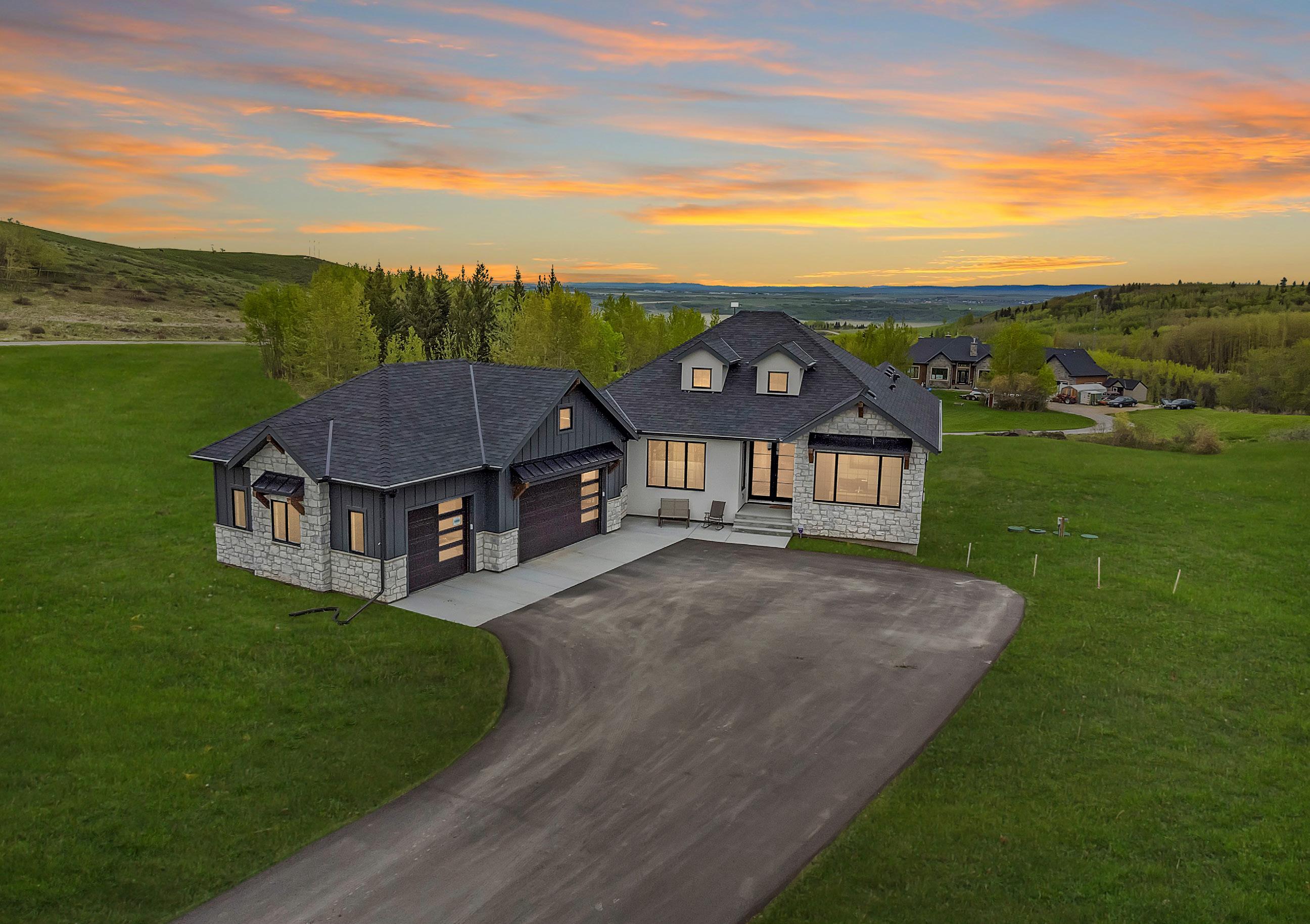 Welcome to your dream retreat on 3.22 acres of pristine hillside, minutes from Cochrane and Glenbow Ranch Provincial Park, and only a 30-minute drive to downtown Calgary. This luxury custom-built bungalow with over 3800sf of developed living space combines opulence and natural beauty, featuring a grand entrance with mosaic tile and hardwood flooring. The expansive living room boasts cathedral vaulted ceilings and floor-to-ceiling south-facing windows, offering stunning landscape views. The kitchen is a culinary haven with a large quartz island, gas range, double ovens, and a unique walkthrough pantry. The primary suite includes a luxurious ensuite wet room with dual showers and a pedestal soaker tub, and a custom walk-in closet. The 600+ square foot deck provides ample outdoor space, with a covered area ideal for gatherings. The main floor also includes an office, laundry room, and built-in dog kennels. The basement features an entertainer’s wet bar, gym, two bedrooms, a five-piece bathroom, and a covered walk-out patio with a hot tub. This property includes an oversized three-car garage, upgraded shingles, air conditioning, and a new home warranty. Immerse yourself in luxury and tranquility in this hillside haven.