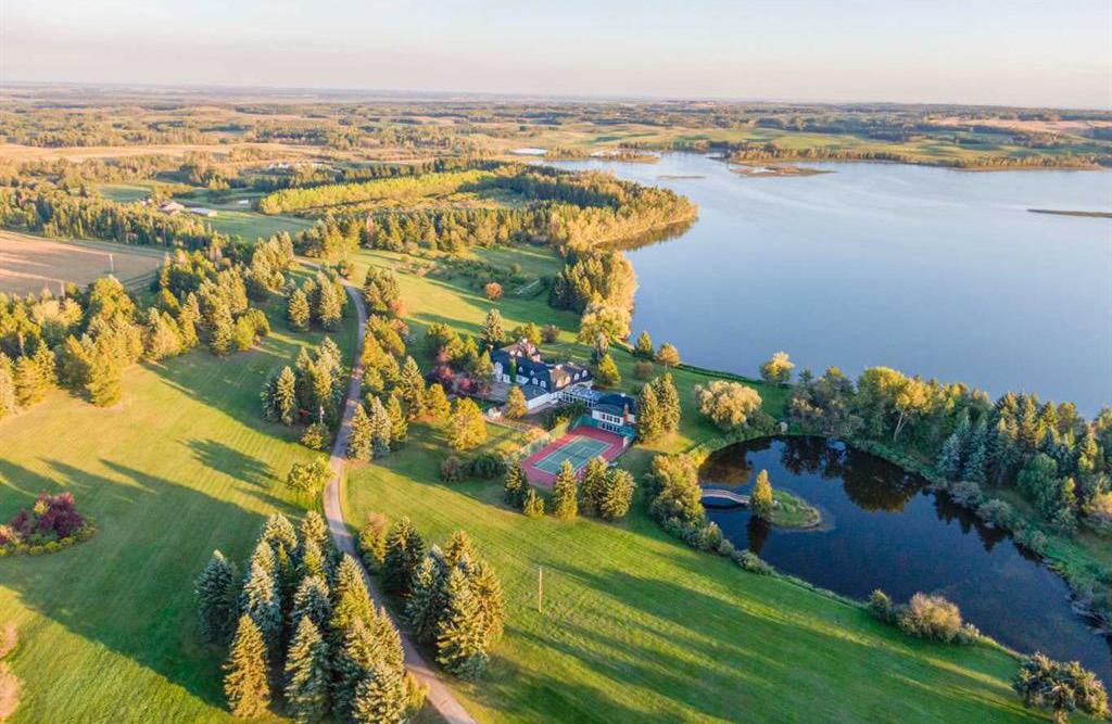The Gadsby Lake Estate in Lacombe County is a unique opportunity to own a secluded paradise with stunning architectural features and exquisite design elements in both the main residence and adjacent lodge. This luxurious estate includes 17 bedrooms and 31 bathrooms, along with specialty rooms such as a library, atrium, sauna, gym, wine cellar, indoor pool, party room, private theater, and games room, all designed for elegance and comfort.