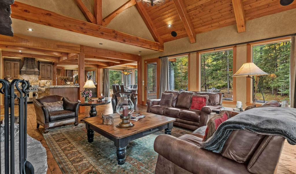 This stunning riverfront country estate offers a unique blend of rustic luxury, year-round recreational opportunities, and breathtaking landscapes on over 10 acres of private land. Located in the lower river valley beneath towering cliffs, the custom-built walkout bungalow features over 4,200 square feet of luxurious living space, along with 1,900 square feet of covered outdoor space. The home boasts abundant natural light, oversized windows with stunning views, high ceilings with timber beams, and a central wood-burning river rock fireplace.