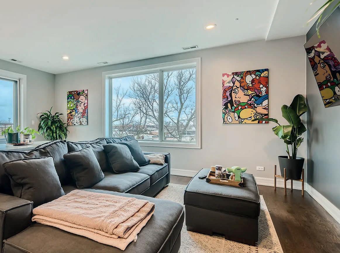 Do you crave a place to use your green thumb? Do you like to entertain? This spectacular 2018 Custom-built singlefamily home on a prime DePaul block features five very large outdoor spaces, including a true rooftop vegetable garden, rooftop deck with a rooftop crane, plus lots of flower gardens. 6600+sf on a 36’ lot, with an attached three car garage. Built with a modern California Contemporary aesthetic and great attention to detail. The dramatic open floorplan features a two-story kitchen ceiling. The floorplan is thoughtfully designed with four bedrooms (three en-suite) and two family rooms, one which can be converted to a fifth bedroom. 5.1 baths. Amazing light due to the large, 3 story storefront glass windows against the floating stairs capturing light year round. Other features include: 2200 bottle wine cellar; Elevator; Full home automation with Control-4; Heated floors throughout, including the garage; Gourmet kitchen with high-end appliances, a four bottle wine dispenser and built-in expresso machine; 8-seat home theater with kitchenette (dishwasher, microwave and refrigerator); Custom closets throughout with two in the primary bedroom; Private Master level with private Study; Two laundry rooms; Five fireplaces -two gas start/wood burning including the large outdoor fireplace adjacent to the outdoor kitchen complete with Wok Station; Lower level workshop with ample storage space; And outdoor snow melt system under walkways and main level patio. DePaul is a walker’s paradise with a 93-walk score, has excellent transit and very bikeable.