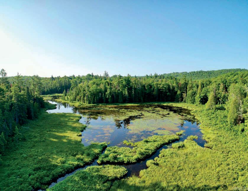 5 BEDS • 2 BATHS • MLS# 50116469 • $749,900 Escape to an exceptional lodge retreat situated on 80 acres of unspoiled northern wilderness. The Lazy Bear lodge, a stunning Hiawatha Log Home, exudes a rustic charm seamlessly blended with the comforts of home. It’s a dream getaway that beautifully combines old-world allure with modern conveniences. As you step into the lodge, an inviting open-concept main floor greets you with expansive cathedral ceilings. Adjacent is a comfortable dining area, inviting you to partake in hearty meals and delightful conversations. The well equipped kitchen, featuring hickory cabinets and gas appliances, boasts all the amenities to make your stay comfortable and enjoyable. The peninsula counter makes for great extra seating! The main level also features two spacious bedrooms and a full bath. The loft area, accessible by charming wooden stairs, provides additional sleeping space for four, making it an ideal spot for kids or guests. Immerse yourself in the ambiance created by floorto-ceiling windows, letting in an abundance of natural light that enhances the beauty of the wooden interiors. As you relax on the front or rear porch, nature puts on a show with wildlife freely roaming the vast property. The lodge is equipped with the impressive Starlink Satellite internet, keeping you connected to the world. For power, there is a propane generator, battery storage, and a solar power system ensuring a seamless experience. Sitting on a concrete slab floor crawlspace, extra storage is abundant! A few steps away, “The Annex”, a large garage topped by a welcoming living quarters offers a rustic living room, a bedroom, and a bunk room sleeping four more. It’s an ideal overflow space for your guests. Also, there is a sauna with a shower and bathroom, providing a perfect spot to unwind after a day of outdoor adventures. With 80 acres of mature forest, frontage on Clark Creek, and a private trout lake, recreational opportunities are limitless—fish, hunt, hike, or ATV with Trail #14 access! This secluded lodge is an invitation to a unique U.P. northwoods retreat.