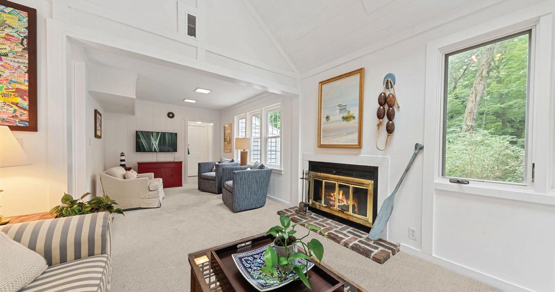 The family room highlights a vaulted ceiling, skylight, and cozy fireplace, adding to the home’s tranquil ambiance. The family room also provides convenient access to an inviting screened porch and flows into a sitting room. The laundry/ mud room has an exterior entrance, allowing for easy clean-up after a trip to the beach.