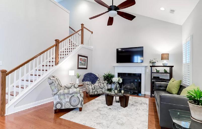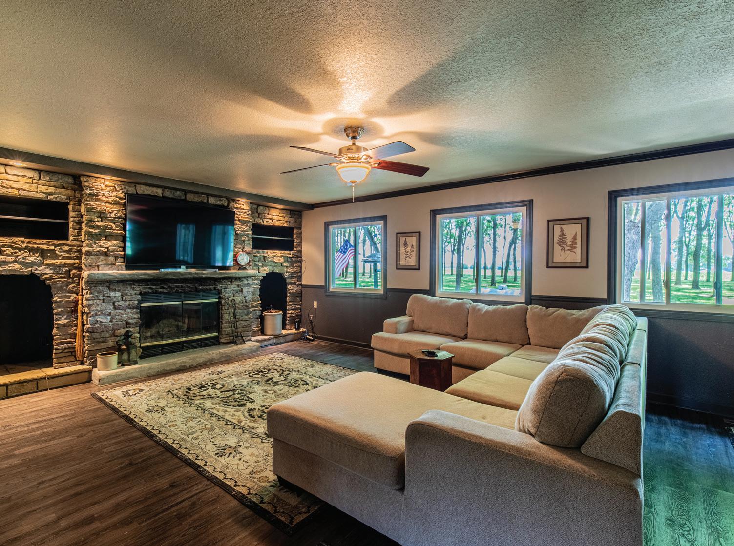 The great room is a visual masterpiece, featuring soaring 21-foot ceilings, exposed stairways, and an abundance of windows that bathe the space in natural light. A floor-to-ceiling stone column fireplace provides a dramatic focal point.