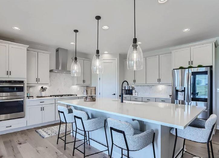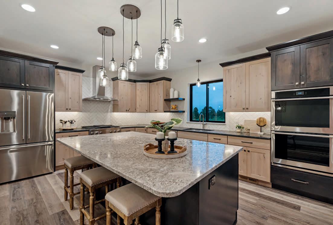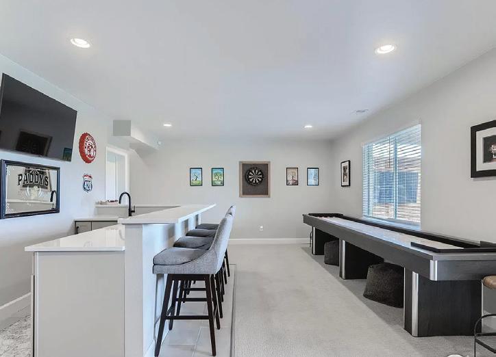 The contemporary kitchen boasts Wolf appliances, a KitchenAid oven, a separate KitchenAid microwave, and a Bosch dishwasher, all juxtaposed with 42” rustic beech cabinets and quartz countertops. Rounding out the kitchen with a walk-in pantry and a spacious island with a farmhouse sink and breakfast bar. The primary suite is a retreat offering a lavish bath, dual shower, and private patio access. Hidden within this suite is a staircase leading to a pre-wired, insulated bonus room.