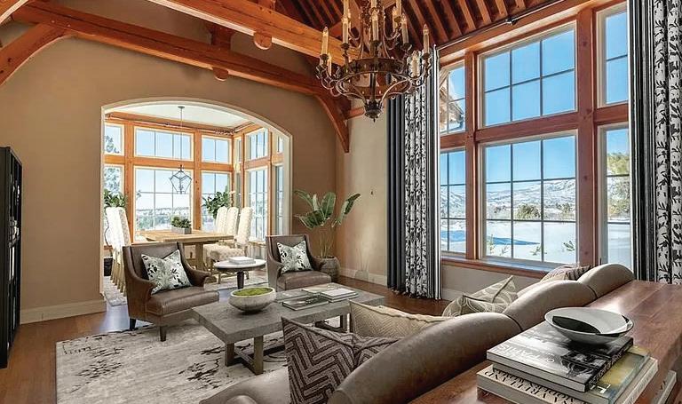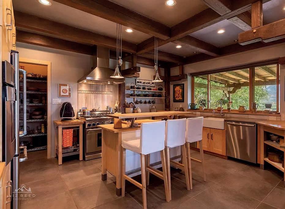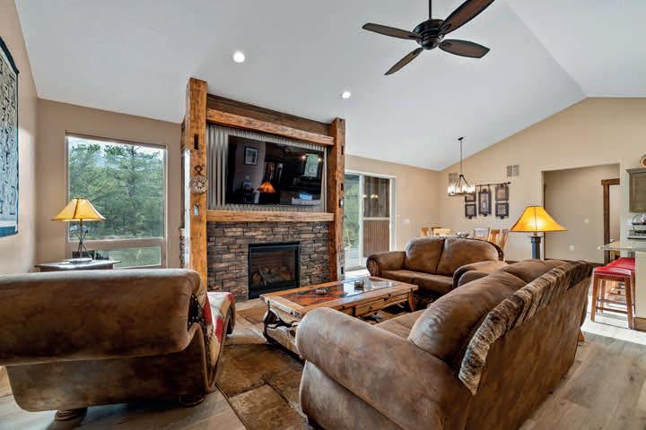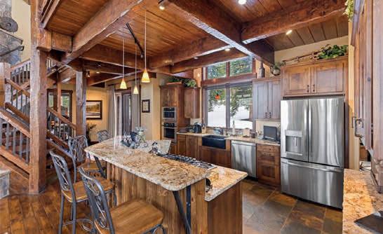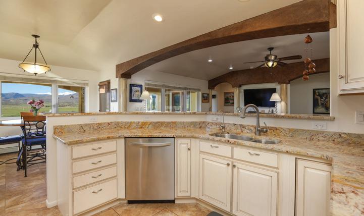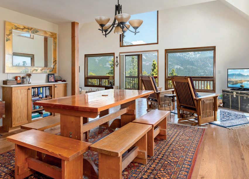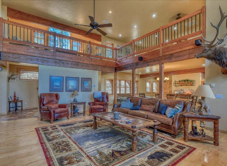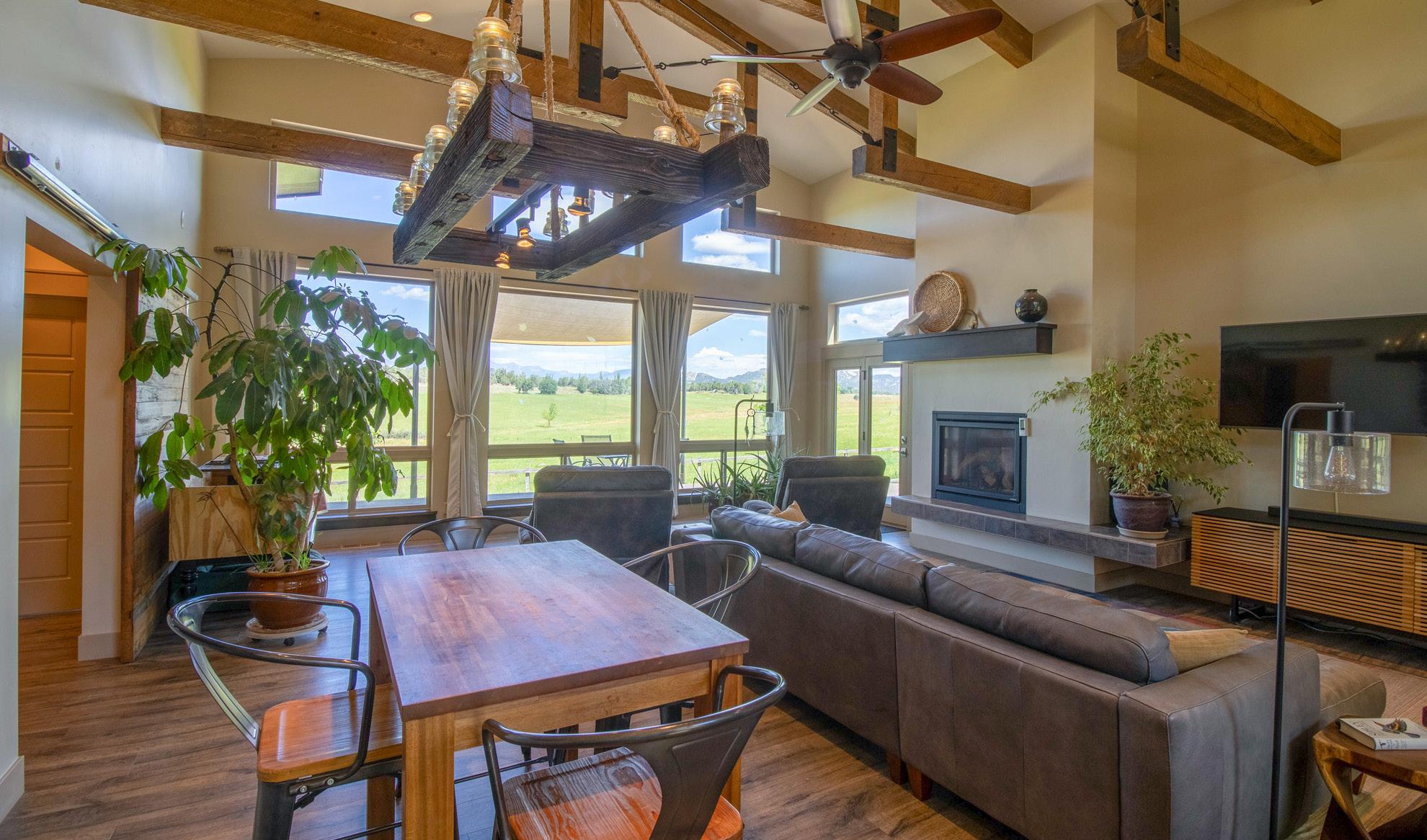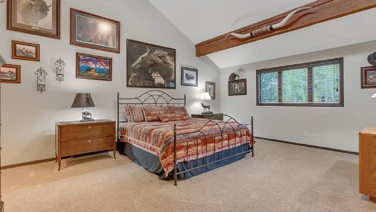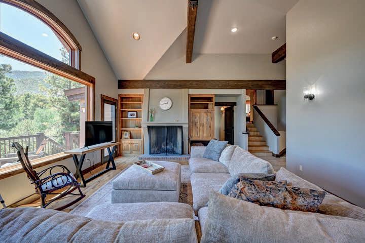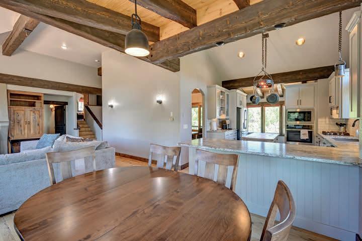 Constructed in 2000, this carefully designed 3,912± square foot home features four bedrooms and four bathrooms. Upon entry, you're greeted by an open floor plan that seamlessly connects the living, dining, and kitchen areas, creating an inviting space for both relaxation and entertainment. The open floor plan is accentuated by tall, vaulted ceilings and large windows framing the surrounding mountain views, as well as beautiful wood beams that add character and charm to the home, creating a warm and welcoming ambiance.