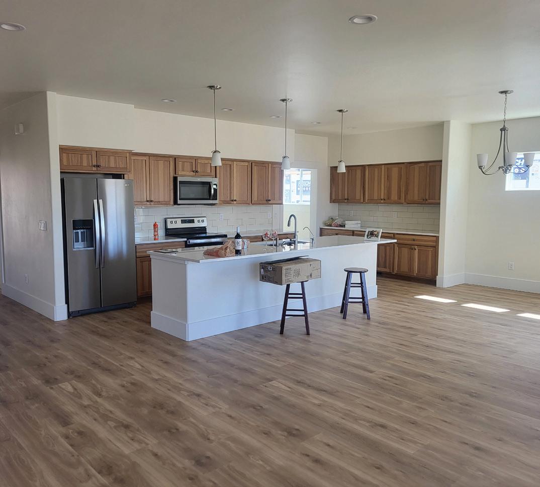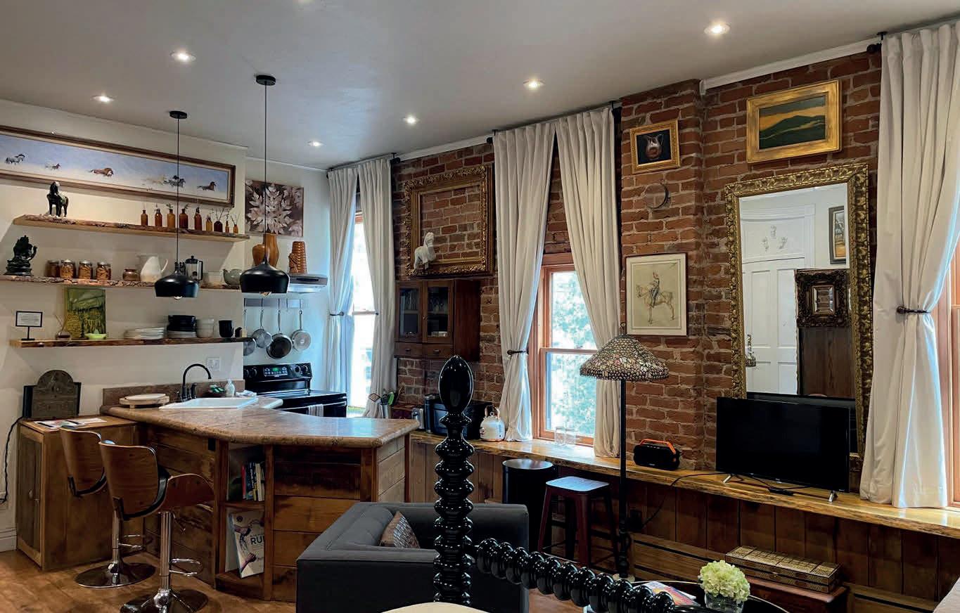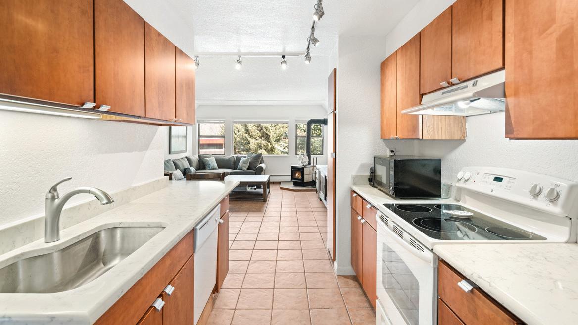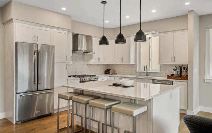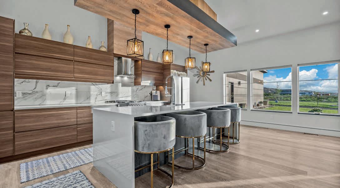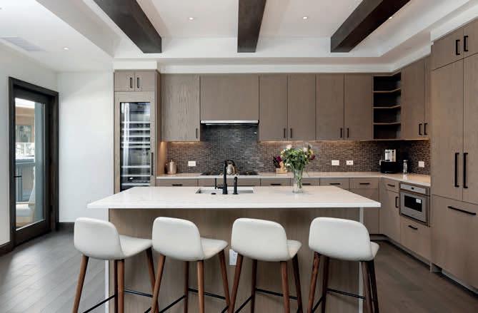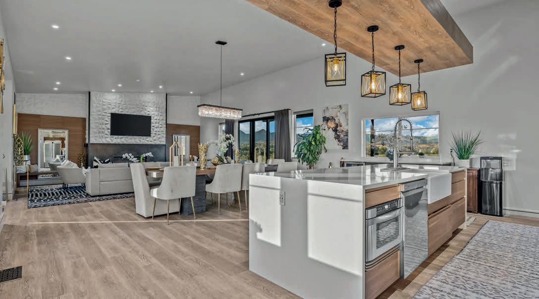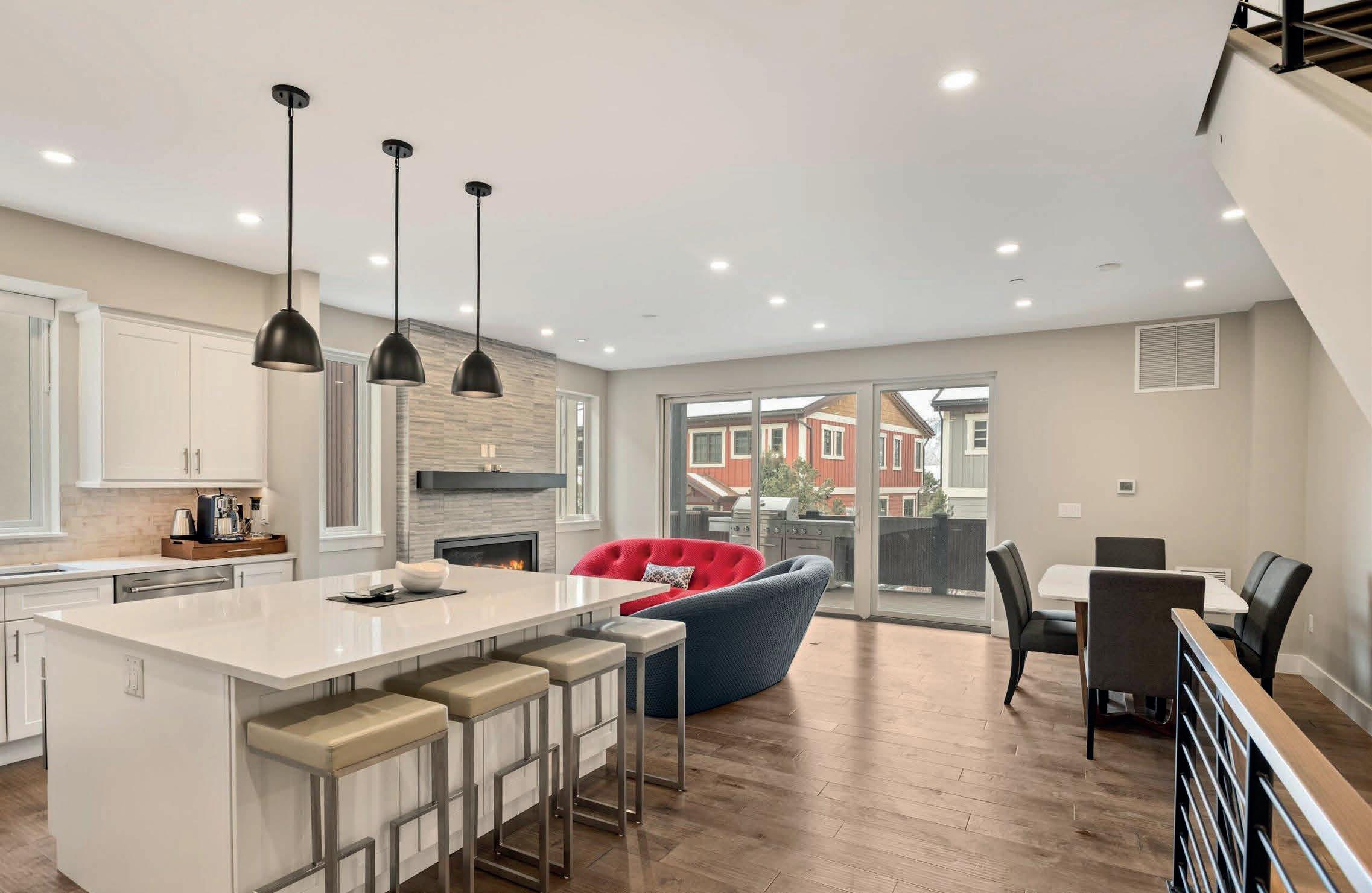 The main area living room includes a gas fireplace with a sleek steel surround, beautiful tambour wood panels, and decorative 3D panels, adding a touch of elegance and warmth to the space. The kitchen is a chef’s dream, featuring a stunning 10ft quartz island with waterfall edges on both sides, custom alder laminate cabinetry, and stainless steel appliances. The cabinets are all self-closing, adding a touch of convenience and sophistication. Large windows throughout the home fill the space with natural light, creating a warm and welcoming environment.