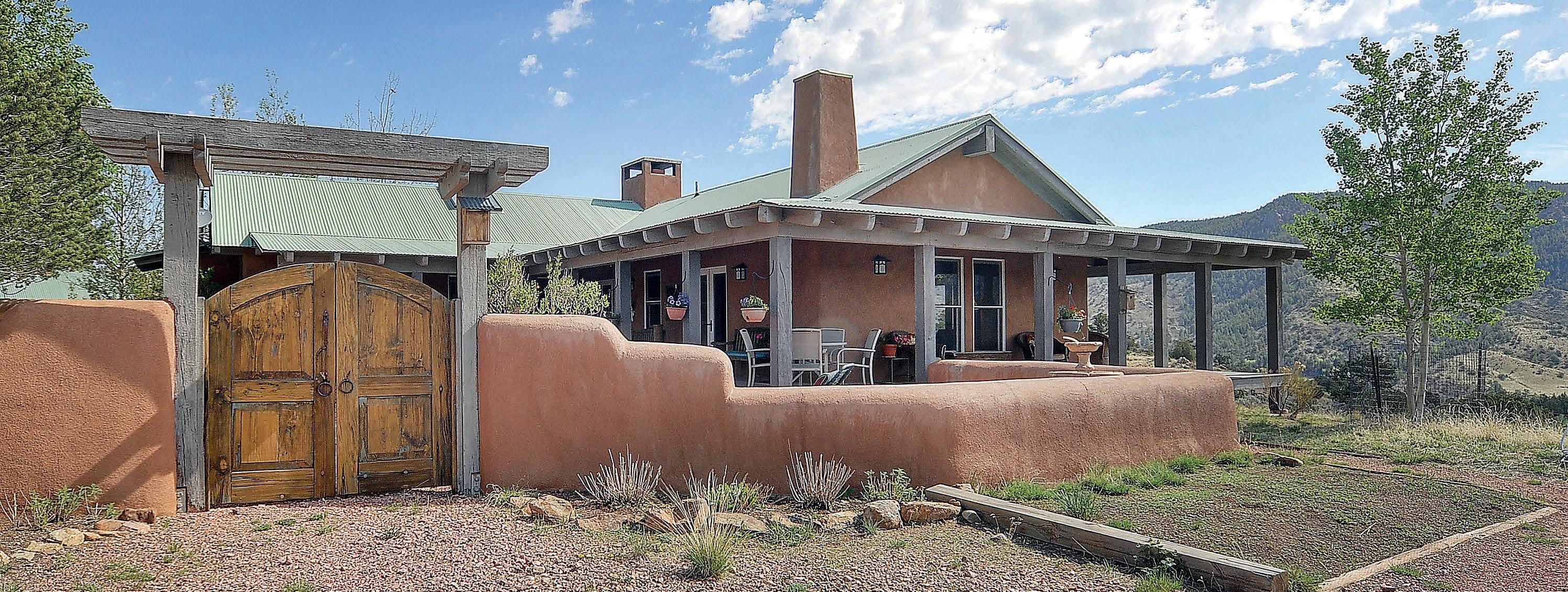 With a touch of the Southwest, this designed home is on 35 beautiful, private acres w/ the Wet Mountains in your back yard, fabulous mountain views! This cruciform shaped, 1 level house, has a great floor plan w/ bedrooms & ensuite baths on either end & the living, dining & kitchen in the center. Careful planning & numerous trips to Santa Fe for inspiration have resulted in a totally custom, comfortable, aesthetically pleasing home. Home is timber frame construction w/ straw bale infill & stucco exterior. Enclosed, landscaped courtyard adds to the look & feel of an adobe hacienda. Main living area, great room, dining & kitchen are all open w/ rough timber frame beams in the vaulted ceiling. There is a massive 2-sided, floor to ceiling, woodburning fireplace between living & dining area & a full wall of built-in shelving. Living area’s large windows provide panoramic views of the gently-sloping, tree-studded property & distant mountains. Two sets of French doors which lead to the covered decks on Main & Guest houses, the perfect spot to enjoy the outdoors & views. Dining & kitchen areas are spacious w/ tons of light from the skylights. Enormous island w/ concrete countertop & plenty of room for more than one cook at a time. Both bedrooms w/ ensuite baths, spacious windows & double French doors to decks, continue the southwest style w/ corner Kiva fireplaces. A few steps through a charming garden area, w/ stone steps & pavers, leads to the guest bungalow, featuring a large bedroom, darling bath, kitchenette, & a spacious bonus room, which has been used as an art studio and workshop. Your guests will also appreciate relaxing on the covered front patio. There is also covered parking for a large RV. Finish off this total package with a detached 3-car garage, room for mountain toys along w/ vehicles. This property has artistic touches both inside & out; being sold partially furnished including some artwork.