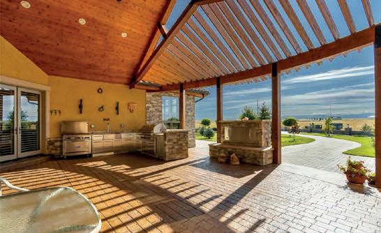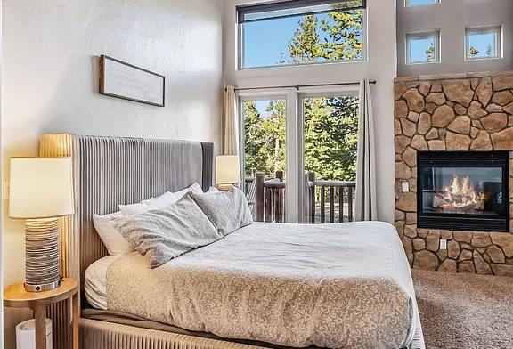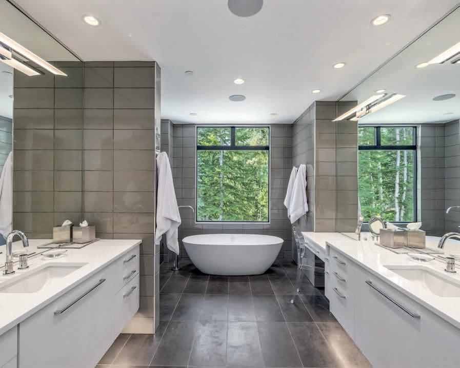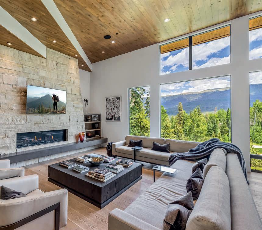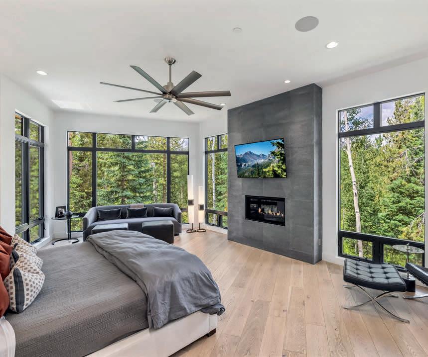 The outdoor living space is perfect for entertaining, with a fireplace, bar, and grill. The accordion window wall and passthrough window from the bar area enhance the indoor/outdoor living experience, making it easy to enjoy the stunning mountain and forest views. Modern conveniences like the Crestron full home automation system ensure a luxurious lifestyle.