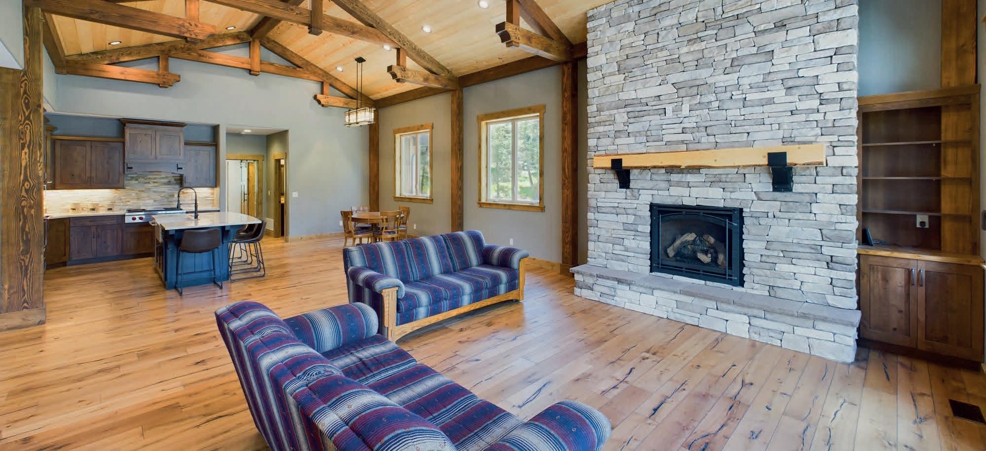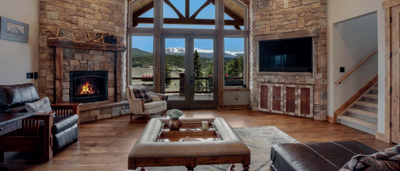 Crafted by the esteemed Crosswood Homes, this walkout ranch-style abode is a testament to natural elegance, integrating the beauty of the outdoors into every living area. The entrance leads to a magnificent great room, adorned with alder wood flooring that radiates everyday luxury. Colorado Timber Frame beams that have been designed and constructed locally line the pine board ceilings, complementing the dry stack stone gas fireplace and flagstone hearth. Large windows and balcony doors open to a secluded Trex deck surrounded by towering pines.