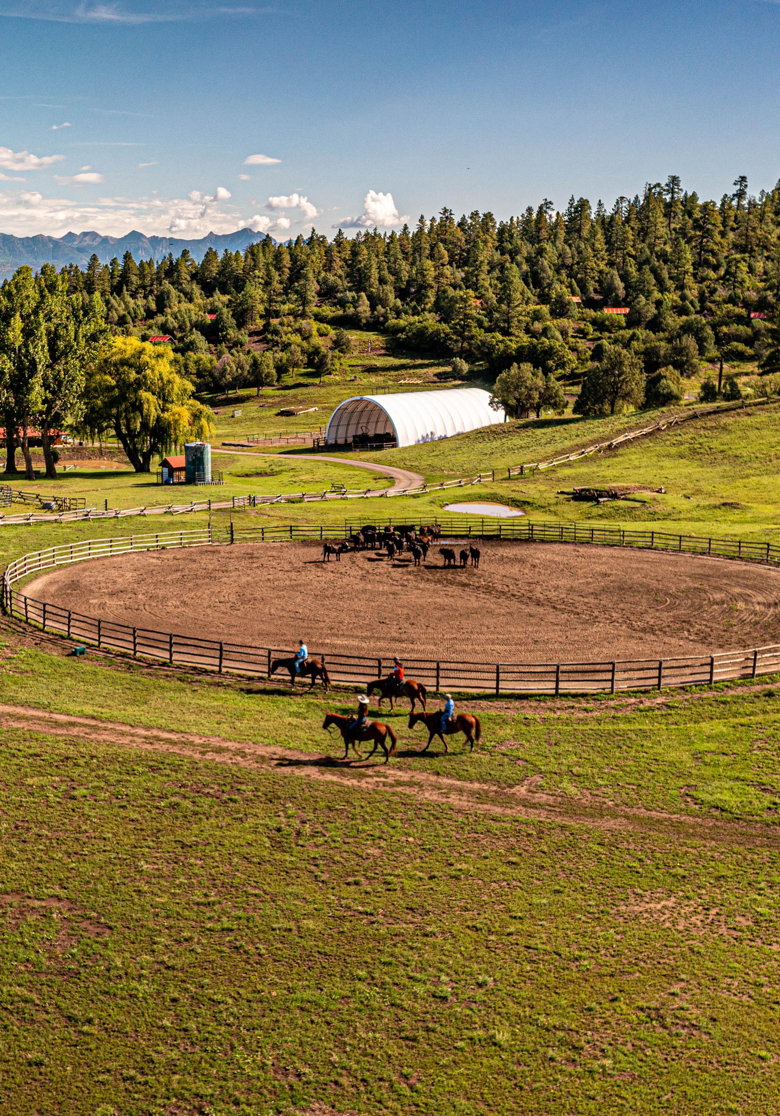 646 acre ranch property has 318 deeded acres and additional 328 acres of state leased land that is transferrable. The terrain features views of the San Juan Mountains that frame the backdrop from every direction. The property borders National Forest and features rolling grass meadows and wooded hillsides. The ranch has several seasonal ponds and sub-irrigated hay meadows. This ranch has been home to the Parelli Institute of Natural Horsemanship for since 1995 and improvements consist of a main house with 2 bedrooms and 3 bathrooms with an office area that could easily be converted to add 2 additional bedrooms. The main house has a covered entry and two covered patios for additional outdoor living space. There is even a covered wash bay for horses on the back patio. A 2nd home on the ranch for staff housing is a double wide modular (purged) on a block foundation with 4 bedrooms and 2 bathrooms. The ranch also has a lodge with a full commercial kitchen, walk-in cooler and dining area that seats over 100 guests and 2 guest rooms upstairs. The property has 11 guest cabins and 32 RV hookups. There are multiple riding and roping arenas on the property and the main arena features a cover. Additional improvements consist of corrals, loafing sheds, tack rooms and storage buildings are scattered throughout the property.