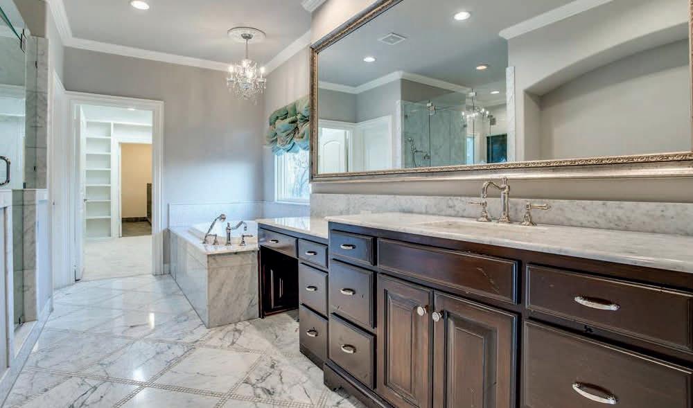 Primary retreat is complete with large picture windows which look out to the stunning pool and natural tree preserve setting. Additionally, the primary retreat has an exquisite ensuite with soaking tub, separate vanities, walk-in double shower, and custom closets.