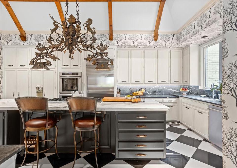 Chef inspired kitchen has a large island, built-in refrigerator, commercial