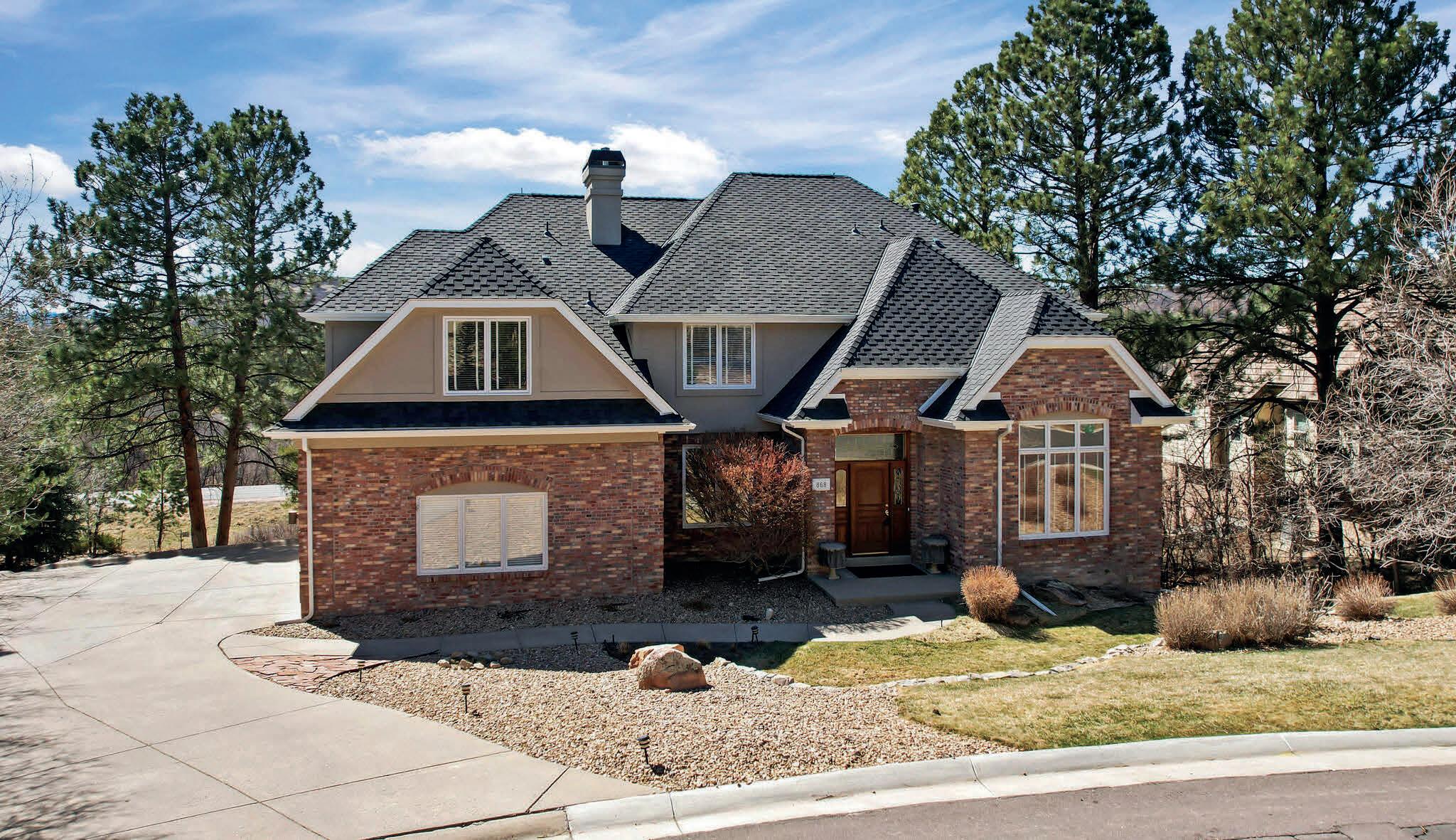 Lowest finished price/square foot in the coveted community of Castle Pines Village. Stately red brick two story, situated on a quiet cul-de-sac with mountain views. Traditional floor plan with flair. Leaded glass and warm wood paneling accent the entry. The study features built-in bookcases and cabinets, and a huge window. An elegant staircase separates the formal sitting and dining rooms. The spacious kitchen includes an island, granite countertops, a corner sink, breakfast bar and sun-lit breakfast nook. The two-story family room is flooded with natural light from the wall of windows and dual doors that frame the grand brick fireplace, bringing the outside in. The family room includes remote controlled blinds. Guest bath in the hallway, an additional powder bath conveniently located off the mud room. The sunny laundry room includes a soaking sink, and cabinet space. A split staircase provides access to the upper level, leading to the spacious Primary Suite. Featuring expansive mountain views, coffered ceilings, three closets, an extended vanity with dual sinks, a luxurious soaking tub, over-size shower and private water closet. The Junior suite includes a walk-in closet and full bath. Two secondary bedrooms have walk-in closets and share a full bath. Offered at $1,450,000