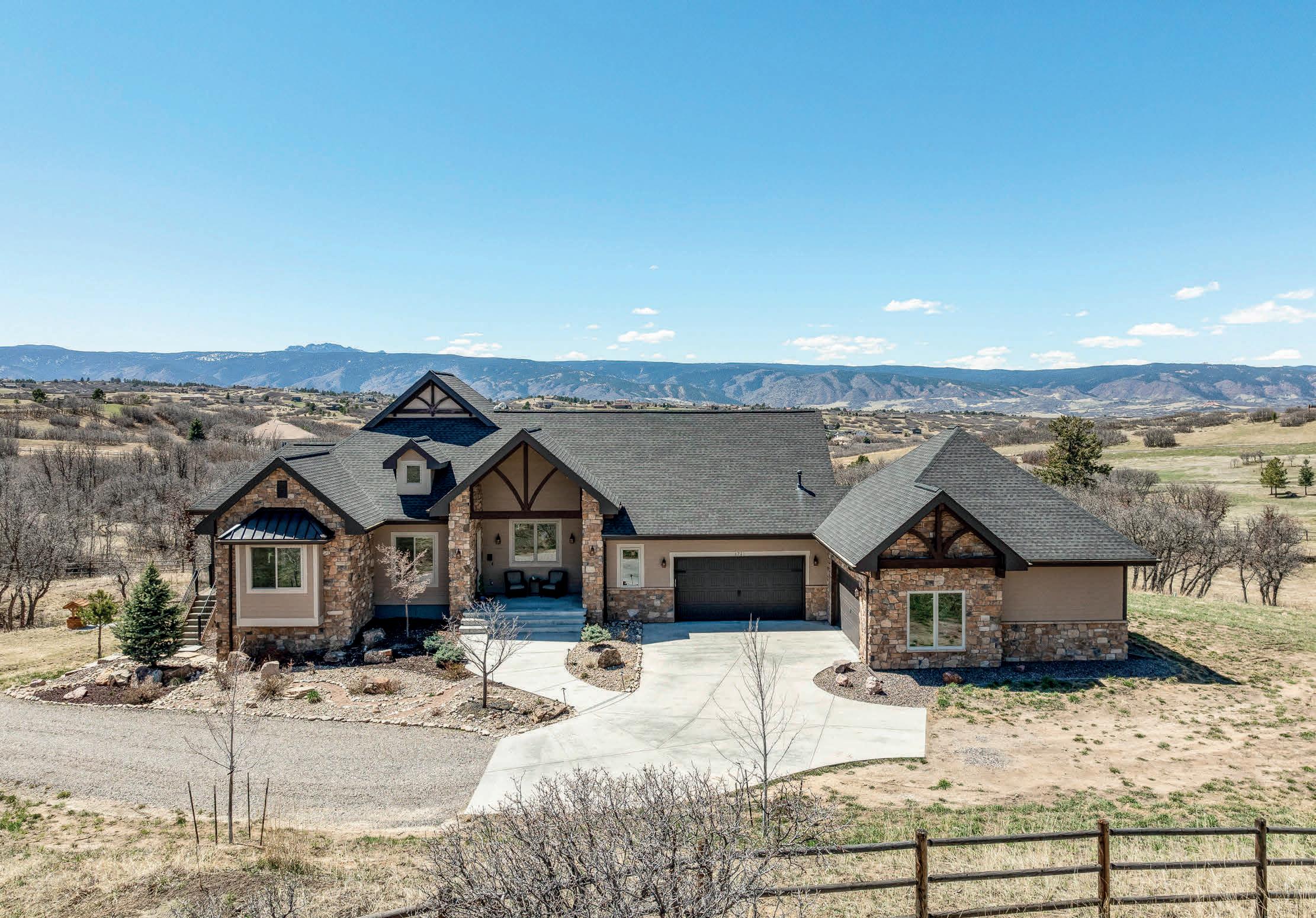 Wow! A meticulously maintained custom walkout ranch offers serene privacy & stunning mountain views from its cul-de-sac location. 5 minutes from the newly coming I-25 exchange w Costco & Trader Joes commercial area with new Keene Ranch access! Main level—a spacious primary suite w/ vaulted ceilings & luxurious bath with no-threshold shower, dual shower heads, & pebble flooring. Surrounded by windows, the Great Room w/ its vaulted ceiling, wood beams & hardwood floors envelopes you within the panoramic views. A corner gas fireplace adds both ambiance & warmth. Dream Kitchen features solid wood cabinets, a 5-burner gas range, double ovens, expansive island with bar fridge, drawer microwave, & walk-in pantry. The dining room, with it’s wall of built in’s & wine storage, fully encompasses the lovely views. Step outside to an expansive covered deck set against the backdrop of breathtaking vistas. Laundry/mudroom is well-appointed w/ full-size sink, custom cabinets & granite countertops. Lower level w/ kitchenette, perfect for entertaining, room for billiard & TV area. 3 bedrooms w walk-in closets, 1 ensuite, (secondary primary suite) 2 w Jack n Jill bath. Oversized sliding doors open to the covered patio, extending the living space outdoors. Unfinished area provides storage, secondary washer/dryer hook-ups & fully encased concrete safe room. Above-the-garage bonus area serves as ideal space for home office/guests/ older children/nanny, complete with dry bar, bathroom & separate entrance. Attached 4-car garage offers ample space for vehicles & storage. An impressive 30x50 ft heated outbuilding includes RV/trailer bay w/ 30-Amp plug, generously sized workshop, electric & access to water. Behind the outbuilding find the private, year-round pond, ready to fish in summer or ice skate in winter. Property is fully mitigated for fire; full perimeter buried invisible pet fence; pre-plumbed gas line for fire pit. Paved roads, abundant wildlife, 16 miles of trails, Quiet-High Speed Fiber, & more.
