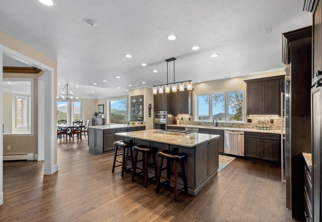 The grand living area, accentuated by soaring vaulted ceilings and a commanding fireplace, opens into a sunroom offering panoramic views of the landscape. The state-of-the-art gourmet kitchen, equipped with top-tier appliances, connects to a vast dining area that unfurls to breathtaking mountain vistas, transforming every meal into a memorable event. The primary suite offers serene views and a spa-inspired ensuite bathroom complete with a fireplace, freestanding tub, and a spacious double shower.