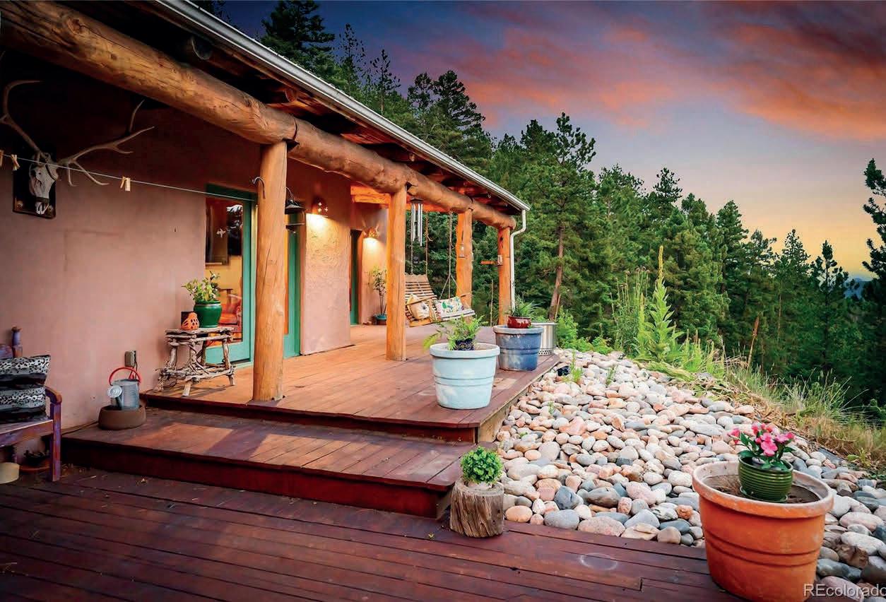 This mountain retreat located in the foothills of Golden is only 16 minutes to downtown! Nestled in the valley amongst the trees and just west of White Ranch Park this home sits on 10 acres zoned A-35. Walking the property you will notice the meadows amongst the manicured trees gives the feeling of owning your own park filled with birds and wildlife. As you enter the into the grand foyer with vaulted ceilings and wooden beams, you will notice the custom built in shelves, art niche’s and detailed accents. The two story stone fireplace and floor to ceiling windows are main focal points of the home. The open layout of the kitchen, dining room, and living room all of which access a wrap around deck make this home an entertainers dream. The east deck commands the most gorgeous sunrises over Denver and every once in a while you may witness an inversion. The main level also includes the primary bedroom suite with soaking tub and steam shower. It also boasts a large walk in closet with private access to the deck over looking the valley and city. This is a truly special home that offers peacefulness from the bustling city!