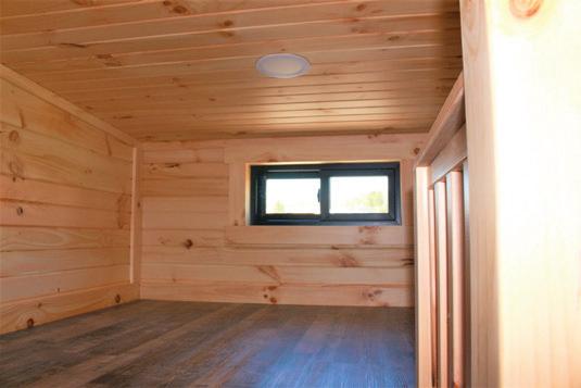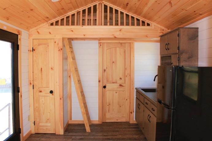 is a 12′ x 26′ , 1 bedroom plus loft , 1 bath , finished on the inside with tongue & groove pine on ceiling & white MDF board on walls with Pine Trim, Kitchen has Birch Cabinets with Stainless Steel sink, Refrigerator & Microwave, master bedroom has a great picture window with shelf & clothes hanger rod, ladder leads to loft for storage and 2nd sleeping area, closet in living room behind loft ladder, mini split cooling & heating