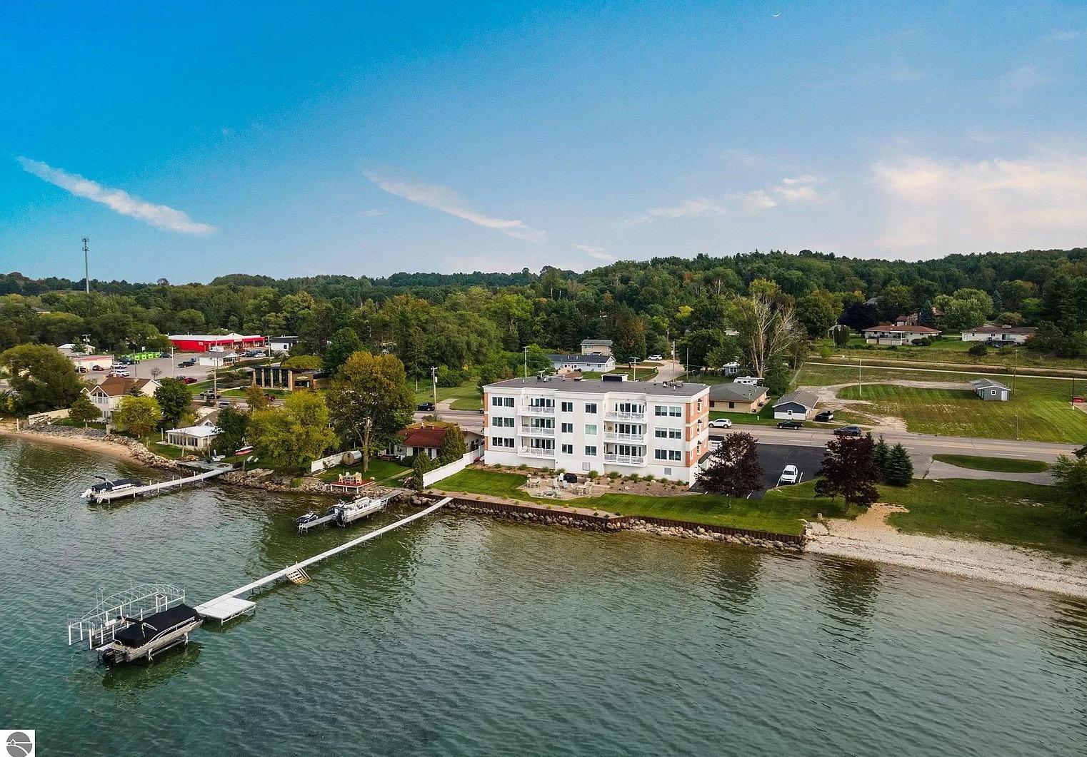 A rare find; these condos do not come to market often!!! Luxury condo on East Bay, with private, shared water frontage and ability to have your own hoist and boat. The vibe of this renovated condo is stunning! From the moment you enter you will be greeted with endless views of East Bay. The open kitchen, dining and living room make an excellent space to relax or enjoy gathering with friends. The large primary ensuite is warm and inviting with a walk in closet and expansive newly completed bathroom. The guest bathroom and laundry room have also been recently redone. Two additional guest bedrooms have water views too. This building has only 6 total units that share 297 ft of private East Grand Traverse Bay frontage with your own dock. The shared patio has recently been completed with a gorgeous new paver area and seawall. You’ll love pulling directly into the heated garage, including two parking spaces and taking the elevator up to your unit. The adjacent property is owned by the GTRLC and can not be developed. All of this within minutes of restaurants, downtown Traverse City, Flintfields Horse Shows, wineries and more. Luxury condo living in Northern Michigan is calling your name!