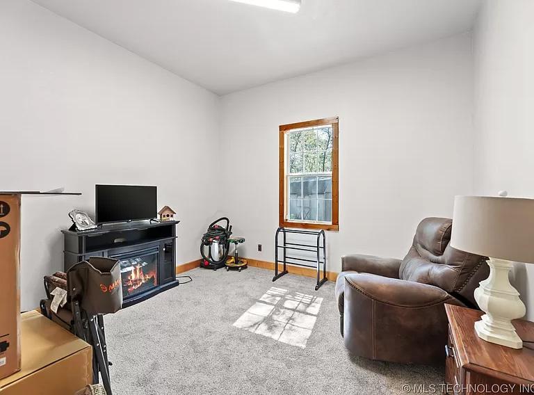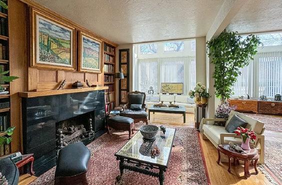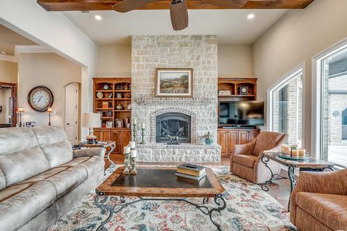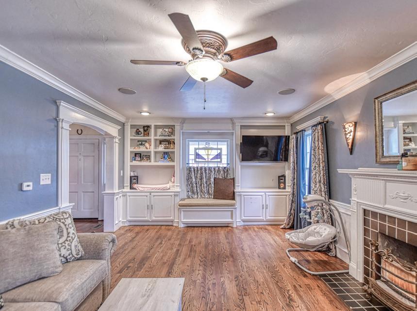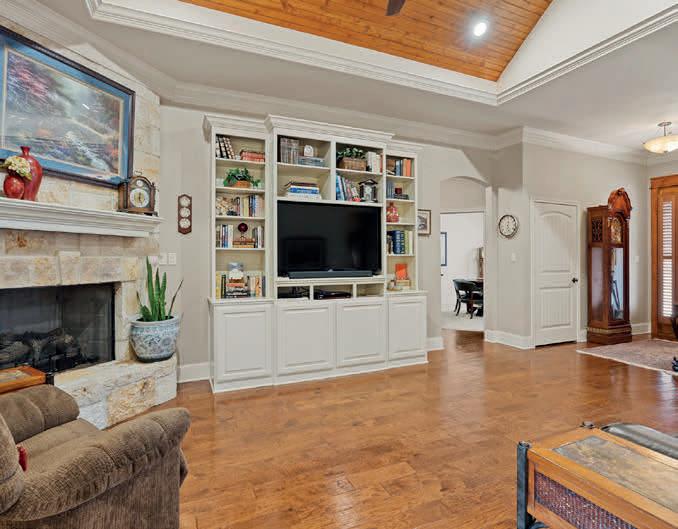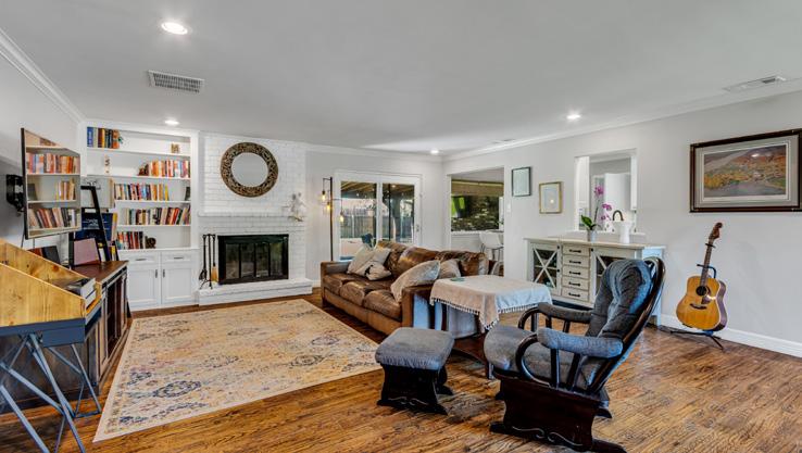 · Living Room: Spacious with custom built-ins and fireplace