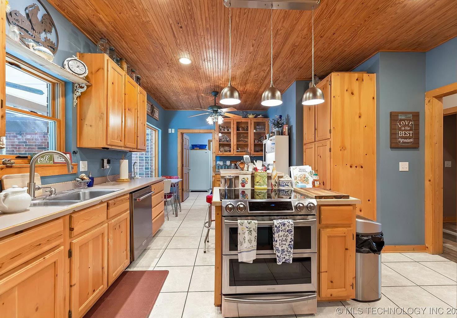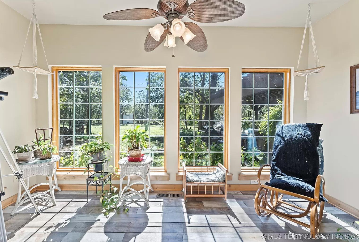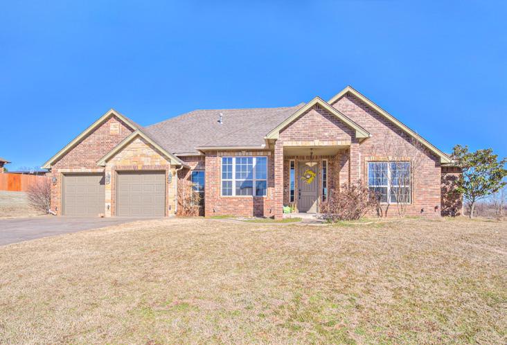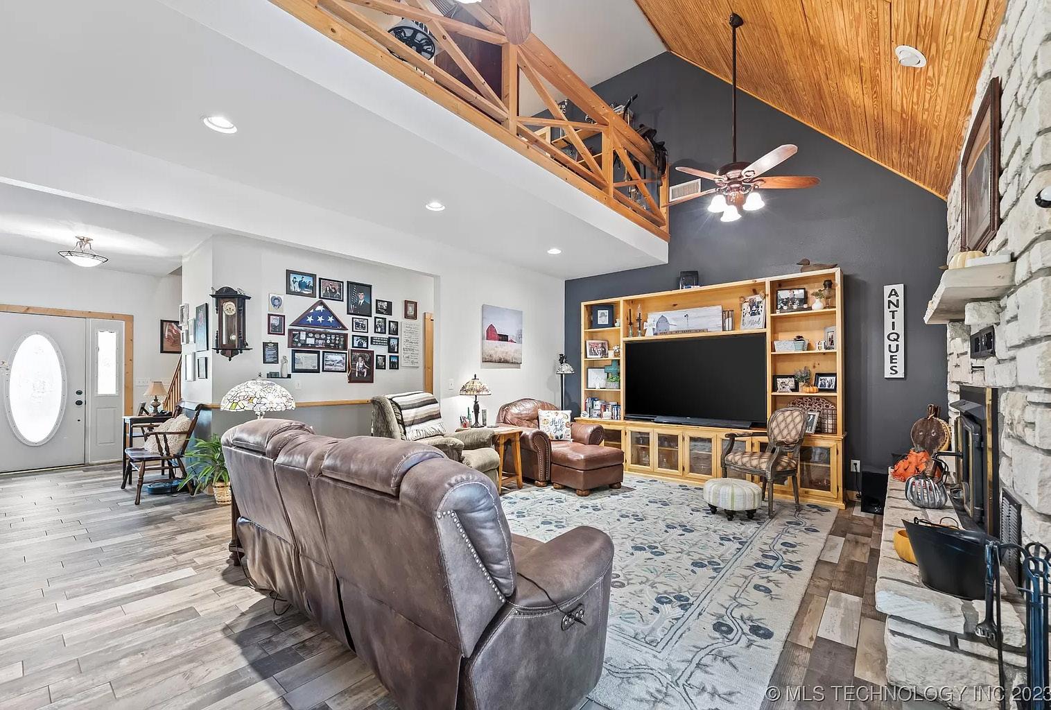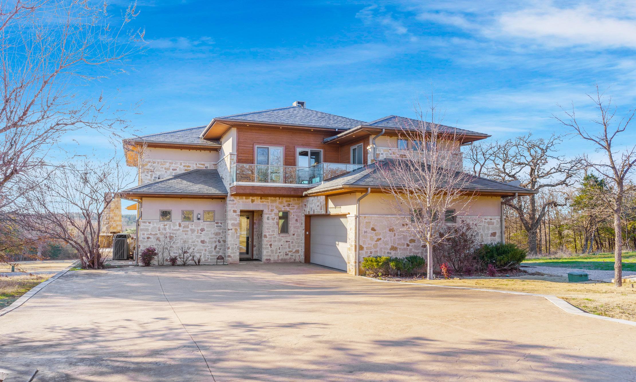 Open your mind and see the true awe of this “unicorn-of-homes.” The spacious layout offers room for everyone and everything and 4 of the 5 bedrooms have a balcony. The large open living room is big enough for a sectional. The kitchen is a chef’s dream with custom cabinetry, new dishwasher (‘23), concealed storage, undercabinet lighting, a massive pantry (12’ wide), double ovens, reverse osmosis, and much more. Be sure to check out the virtual tour video for more information on all the kitchen has to offer. The primary suite is conveniently located on the bottom floor along with the utility room and a guest bathroom. This A-frame style home has no attic; all that storage is built into the home with nooks and crannies throughout. The entire property is fenced with wrought iron including the front yard, back yard & driveway and just shy of 1 acre. It also has 2 storage buildings, a separate garage/shop, carport, and a storm shelter. Another great feature is the large 16x18 sunroom, right off the primary bedroom. This is perfect for a large office space or craft room. Recent updates include downstairs HVAC (‘22), class 4 high-impact roof and decking (‘20). Washer, dryer, and fridge (‘23) are included with the home.