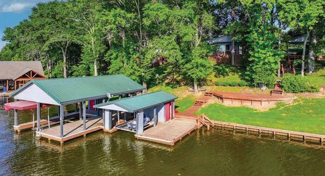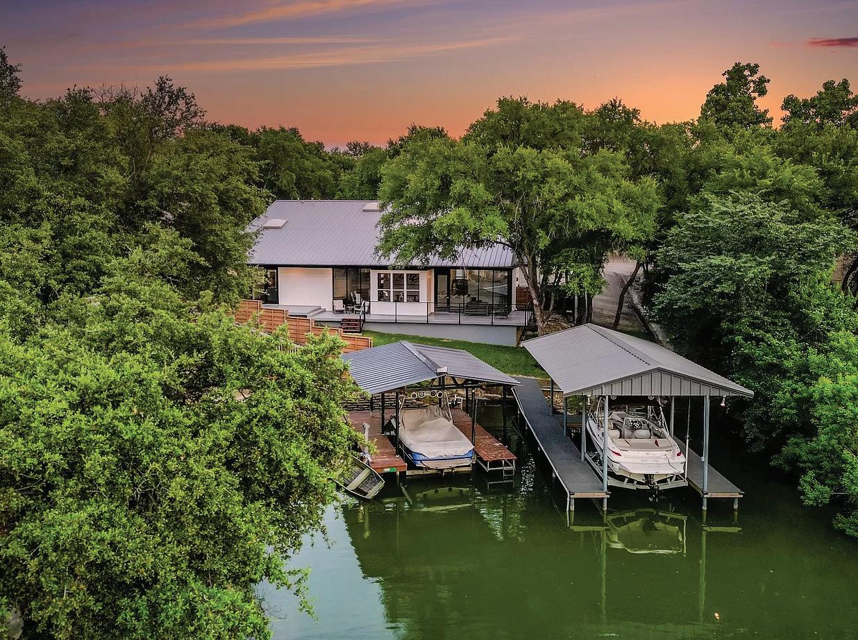 Nestled in a serene cove, this 4,700 sq ft lake house, designed by Jane Page Design Group and built in 2019, combines elegance and modern luxury. The property features extensive landscaping, ample guest parking, and breathtaking views of the private lake from floor-to-ceiling windows. The open-concept living areas have high-end finishes, motorized shades, and a chef’s kitchen with quartz countertops and Thermador appliances. With five luxurious bedrooms and five and a half bathrooms, the home ensures privacy with two separate staircases. Outdoor amenities include a porcelain-tiled patio, a boathouse with boat lifts and waverunner lifts, and access to a 3,000-acre lake ideal for fishing and water skiing. Community perks include Arrowhead Park, a golf course, a clubhouse, and various social clubs, offering a luxurious and tranquil lifestyle.