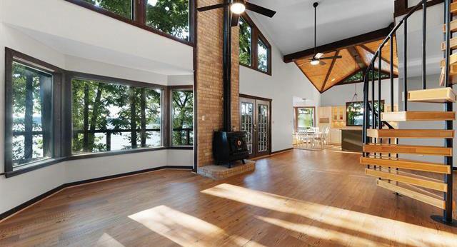 Escape to this serene lake house, where rustic elegance meets natural beauty. Inside, a cozy interior with an open-concept design and fireplace invites relaxation. Ascend the spiral staircase to find a loft with four custom bunk beds and ample storage, offering a perfect retreat above. Enjoy stunning lake views and plenty of closet space in this charming getaway.
