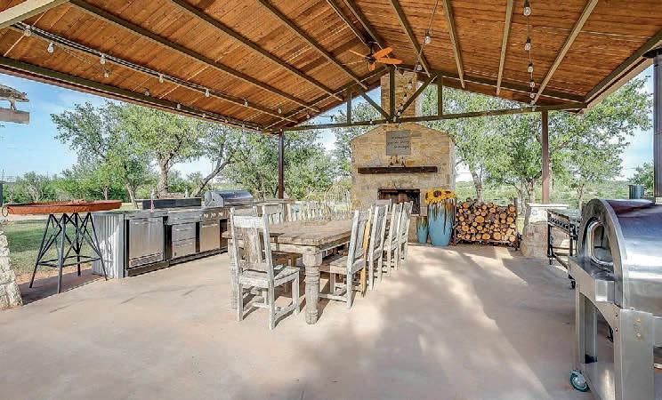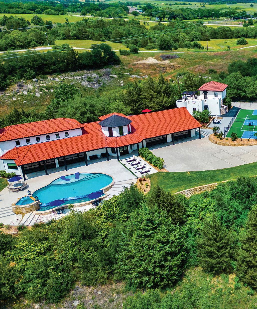 and spa area made for relaxing. The pool house also has 2 bedrooms, a loft, and 1 and a half baths, and a 4-car garage with more custom glass doors. The fully equipped Parisian guest villa known as “A Walk in Paris” is ideal for hosting guests in a cozy and intimate space. It will leave your guests feeling like they are on vacation. You will also find a secluded area featuring a putting green, fire pit, and pergola covered custom hot tub. Fitness enthusiasts will appreciate the on-site fitness center, equipped with complete home gym, kitchen, laundry, and half bath. Stay active and maintain a healthy lifestyle day or night on the sports court featuring pickleball, tennis and basketball. Other property amenities include a Helipad situated next to a large hanger or barn ideal for storing helicopters, boats, RVs, or horses. A driving range, hen house, solar farm that produces 74,250 kilowatts of power - the ultimate in energy efficiency, pastures, deck with comfy couch to have a front row seat each day for sunset, multiple outdoor entertaining areas, and a highflying Texas flag round out this beautiful home. Don’t miss the chance to experience the epitome of refined TEXAS living in this exceptional estate!