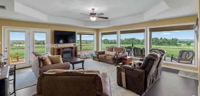 Rocking F Ranch is a 300 acre +/- ranch located in Davis, Oklahoma. This beautiful section of property boasts a wide selection of features including: 2 Homes, Beautiful rolling hills, Seasonal creeks, 8 ponds, 175 producing native pecan trees, 13 young grafted paper shell pecan trees, and 10 cross-fenced pastures with either rural water or ponds for watering. An abundance of Bermuda and Native grasses. The main farmhouse (built in 2001) features 2,400 sq ft +/- of living space, Poly steel construction, rural water, total electric, 3 bedrooms, 1 office (could be 4th bed), 2 baths, 2 car garage, open concept, mother-in-law floor plan, huge laundry room with tons of storage complete with sink, 5-yearold roof, 3-year-old heat pump heat and air system, 2 hot water heaters along with many other features. The main farmhouse is accompanied with a surrounding white poly fence, above ground swimming pool complete with deck, huge open patio, 2 covered patios, 30’x40’ shop with electricity and concrete floor, 18’x22’ lean to, 48’x50’ barn with working corrals and chutes for both cattle and calves complete with