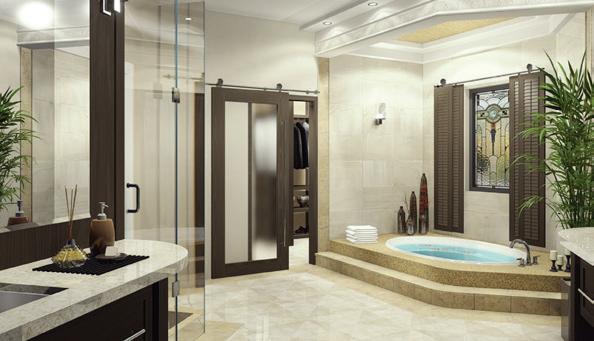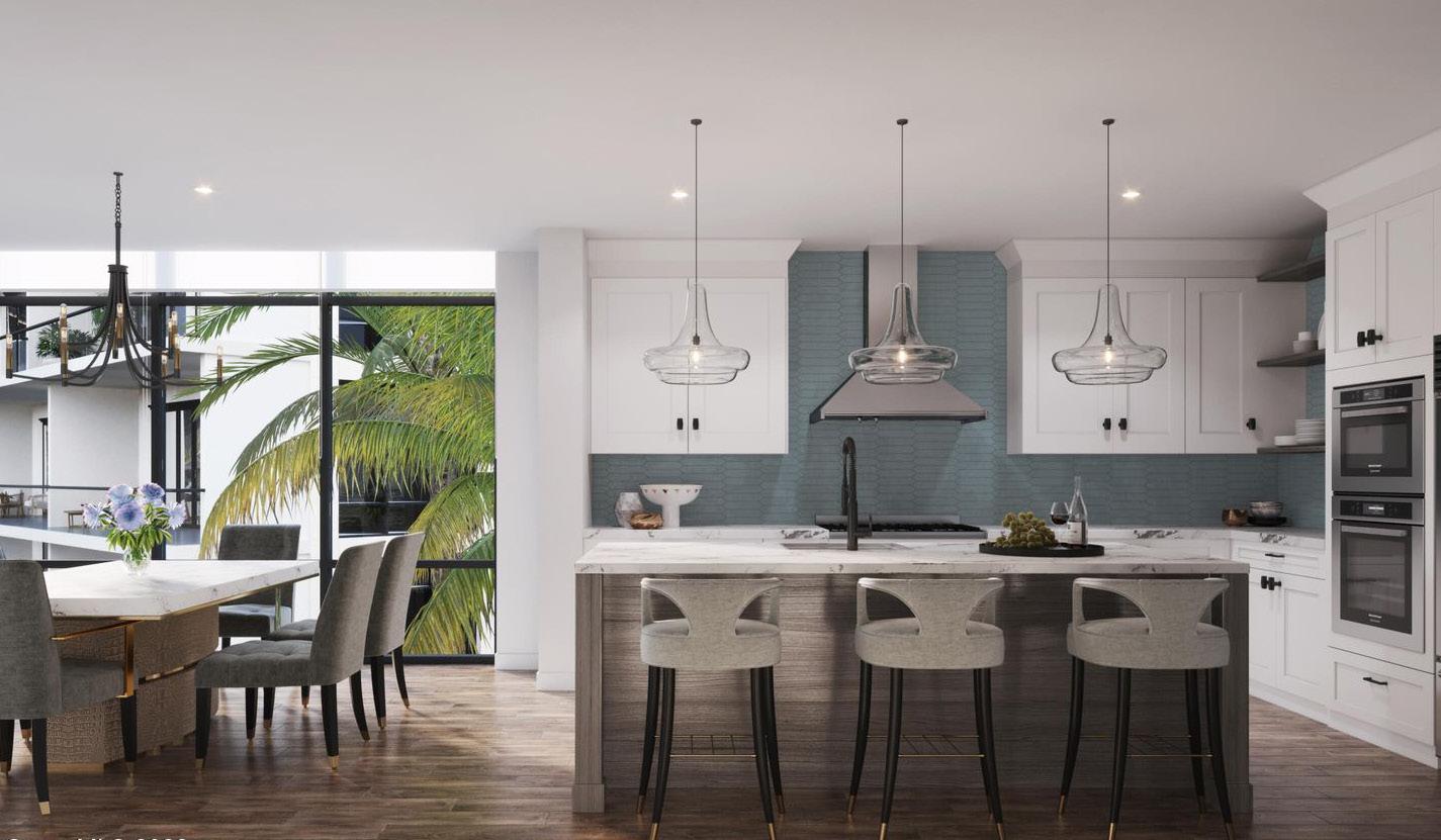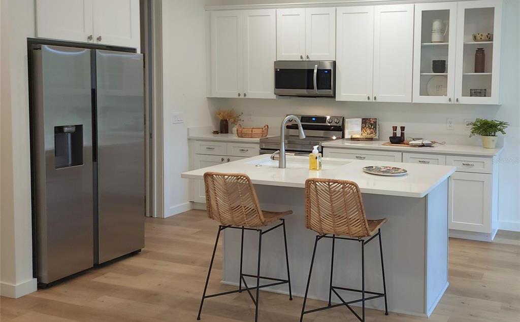 custom designed stair and balcony railing, to the inlaid wood floors and custom fireplace mantle. All bedrooms are en-suite, and offer spacious closets with built-ins for plenty of storage. The primary suite and two guest suites are on the first floor, and the third guest suite is on the second floor. There are four balconies – terraces to enjoy the city and river views from, one of which is a spacious roof top terrace. VillaRiva is a natural gas community, which allows for a gas cooktop in the kitchen, a gas grill on your riverfront terrace and two gas fireplaces to cozy up to with a good book. The gourmet eat-in chef’s kitchen with a center work island features new GE SS Monogram appliances, pull-outs in the lower cabinets, and a beautiful tumbled marble backsplash with a focal design at the gas cooktop. The split BR floor plan is the perfect layout for your guests to retire to their guest retreats to relax for the afternoon. If sharing with friends and family is your passion, the open floor plan layout offers a wonderful flow to enjoy while entertaining