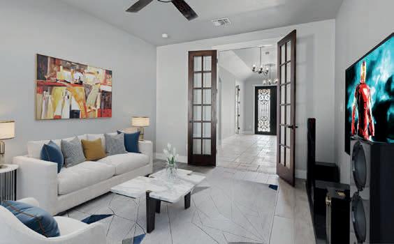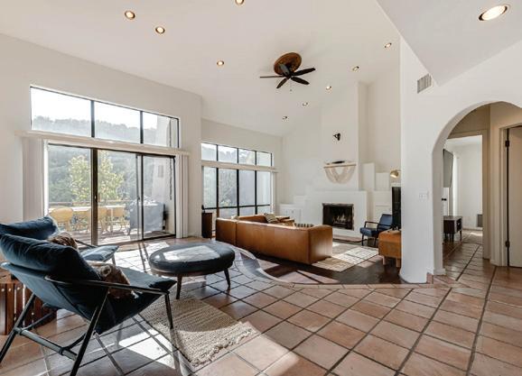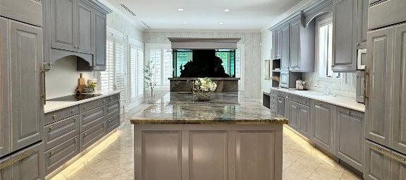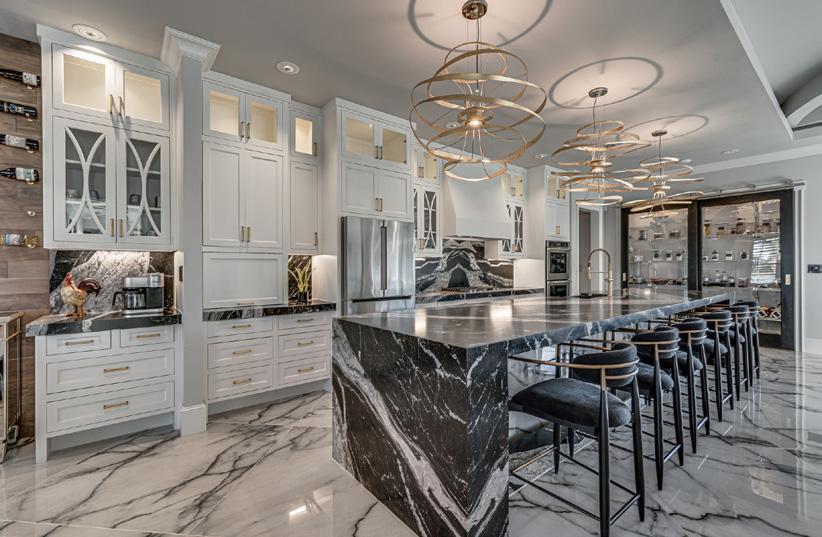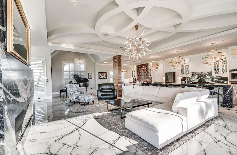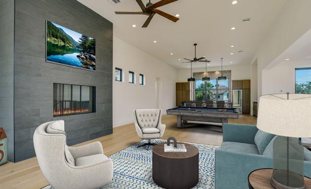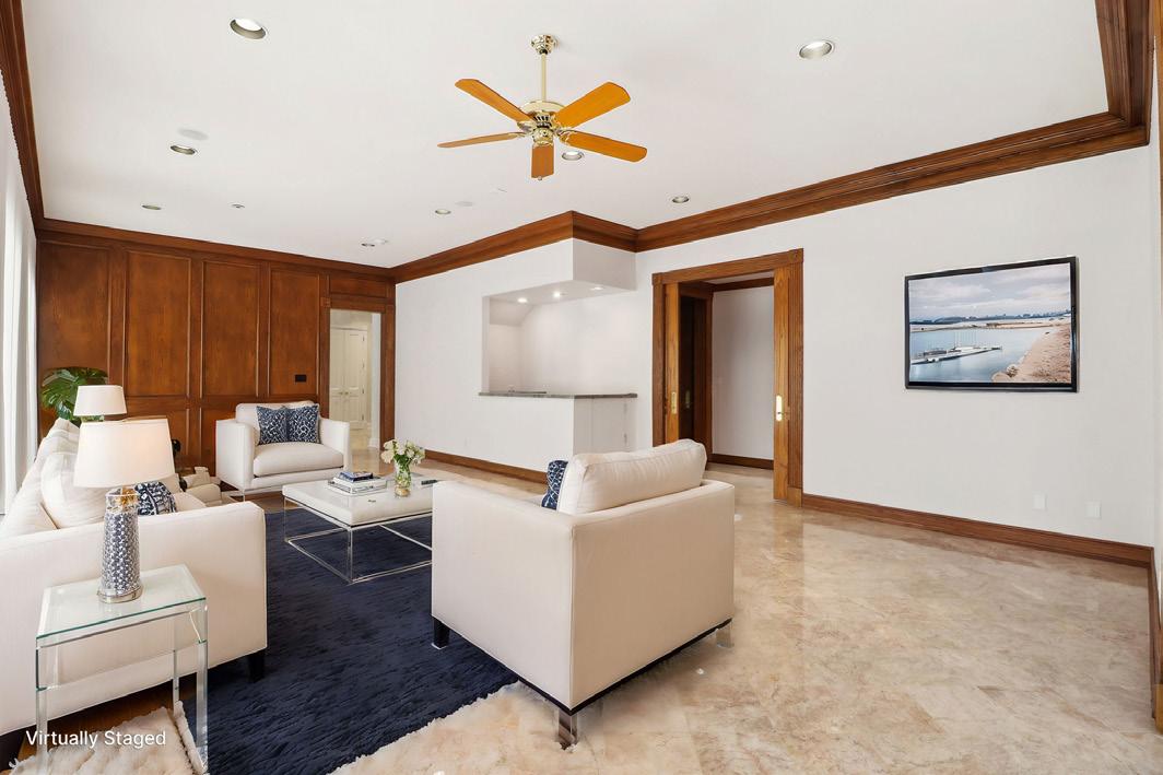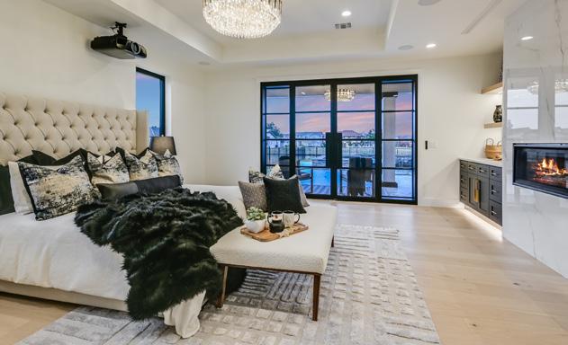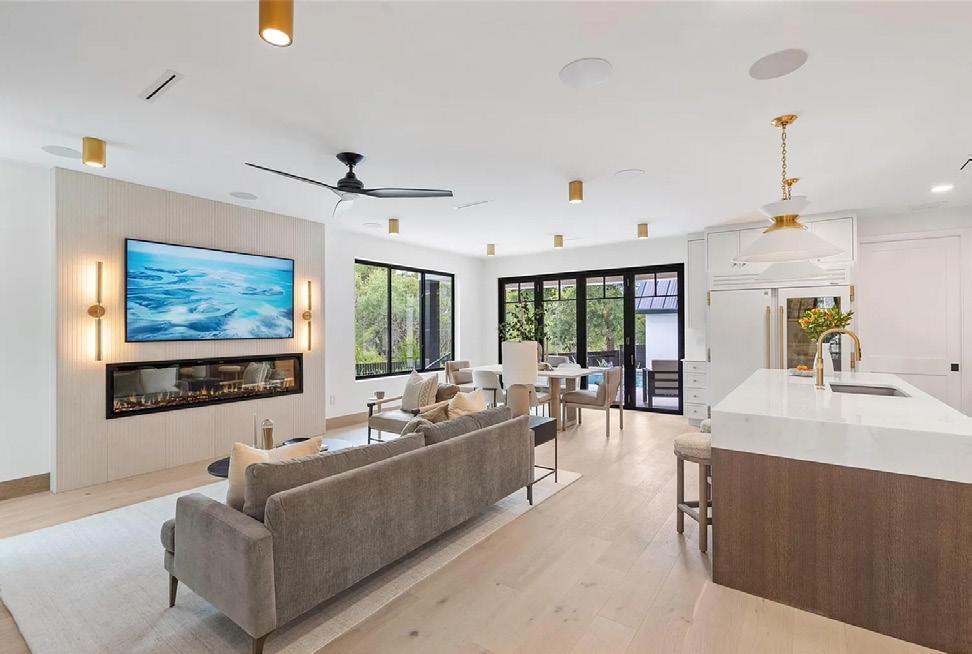 Inside, a dedicated office with an en suite bath offers versatility, while the open living area captivates with custom cabinetry and a dramatic Dekton-stone fireplace. The gourmet kitchen boasts imported Italian tile, premium Thermador appliances, marble countertops, and a hidden butler’s pantry.